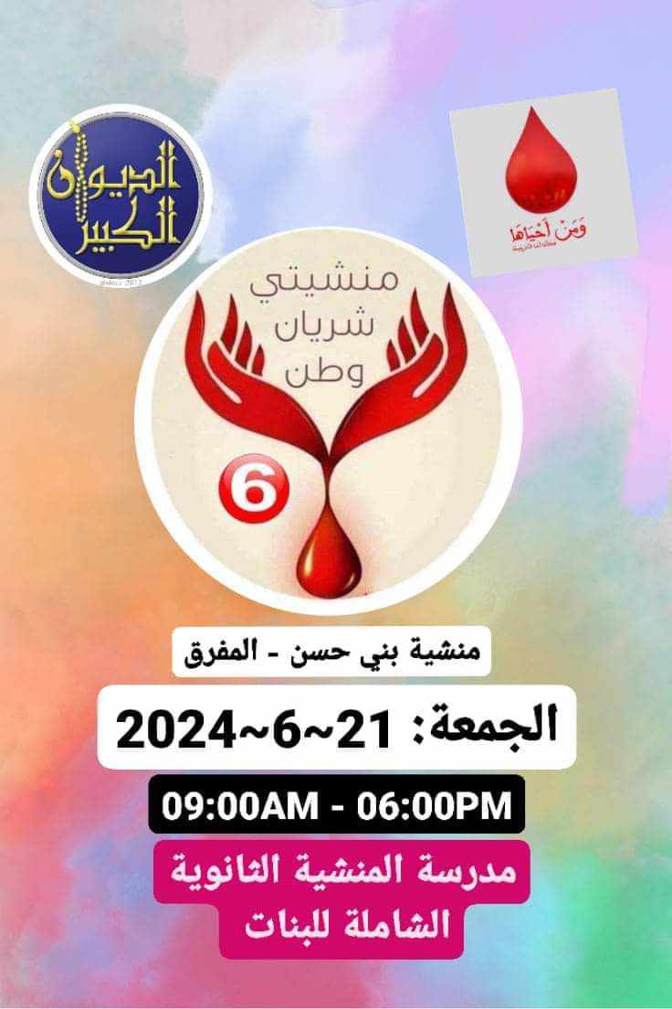 تزامنا مع الاعياد الوطنية الاردنية وبنظيم من مجموعة الديوان الكبير – تستعد منشية بني حسن – المفرق لتنفيذ عمل انساني وطني فريد للمرة السادسة من خلال تنفيذ مبادرة حملة التبرع بالدم (منشيتي شريان وطن 6) تحت رعاية كريمة من الدكتور أحمد حسن شديفات – مرشح اجماع عشيرة الشديفات واهالي قضاء منشية بني حسن في الانتخابات البرلمانية القادمة.