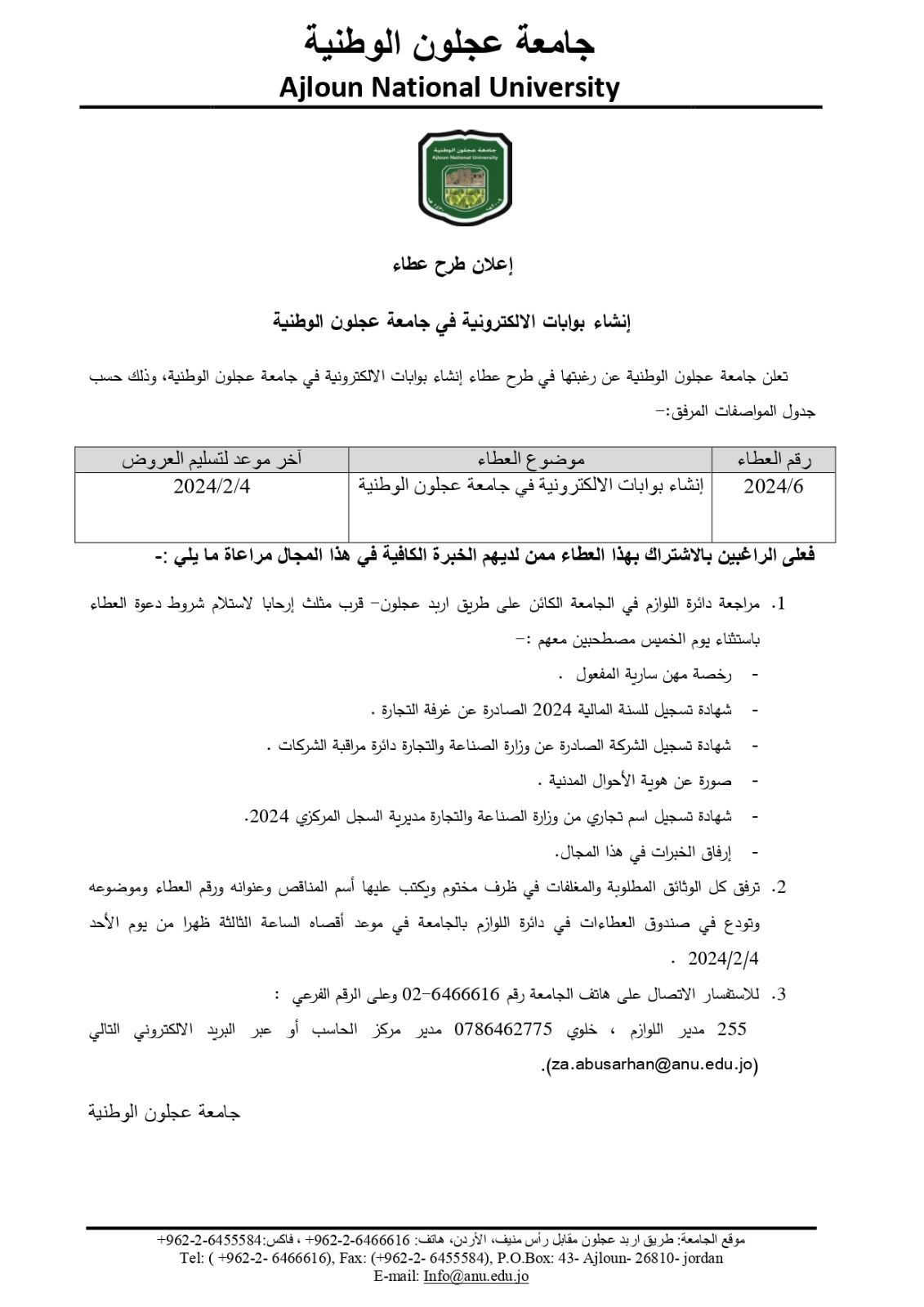 اعلان عطاء /إنشاء البوابات الالكترونية في جامعة عجلون الوطنيةأخبار جامعة عجلون الوطنيةأخبار عجلونية في يناير 28, 2024 أكمل القراءة شارك