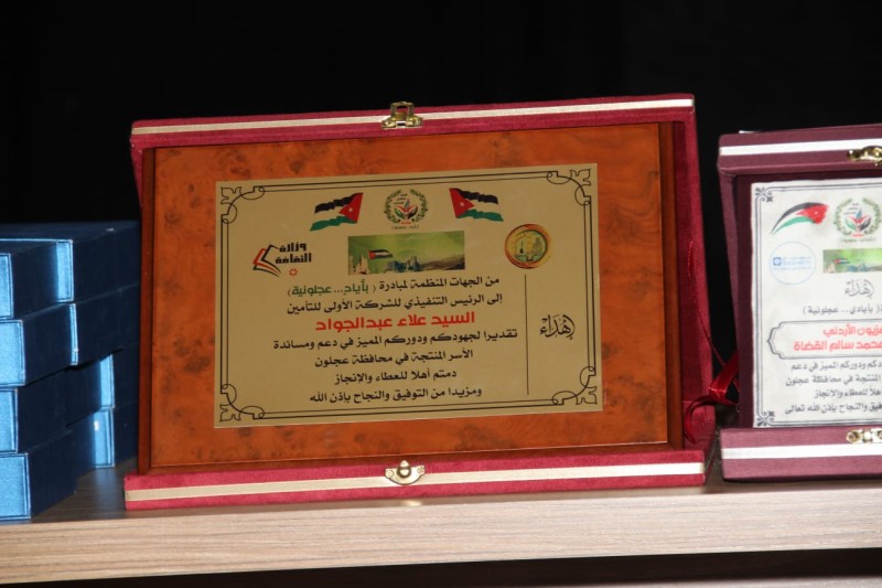 وفي نهاية الحفل كرم راعي الحفل الرئيس التنفيذي للشركة الأولى للتأمين علاء عبدالجواد بحضور مدير ثقافة عجلون سامر فريحات ومنسق المبادرة منذر الزغول عدد من الداعمين والمساندين للأسر المنتجة ووسائل الإعلام المختلفة ، كما تم تكريم 80 أسرة منتجة في المحافظة ، وكرمت الجهات المنظمة للمبادرة الشركة الأولى للتأمين والرئيس التنفيذي للشركة علاء عبدالجواد تقديرا لدعمهم ورعايتهم حفل إطلاق المبادرة .
