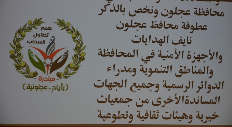 وبدأ الإحتفال الذي أقيم في مسرح مركز عجلون الثقافي و اداره الشاعر ياسر أبو طعمه بأيات من الذكر الحكيم تلاها الحافظ لكتاب الله الشاب أصيل الزغول ، كما ألقى منسق المبادرة عضو مجلس محافظة عجلون منذر الزغول كلمة أكد فيها أننا نكلل اليوم جهودنا السابقة التي امتدت على مدار إثني عشر عاما مضت من إقامة معارض ومهرجانات المنتجات الريفية والحرف اليدوية العجلونية والتي زاد عددها عن 20 مهرجانا ومعرضا لغاية الأن ، كنا فيها نعمل جميعا كخلية نحل لتقديم كافة أشكال الدعم والمساندة للأسر المنتجة في محافظة عجلون .