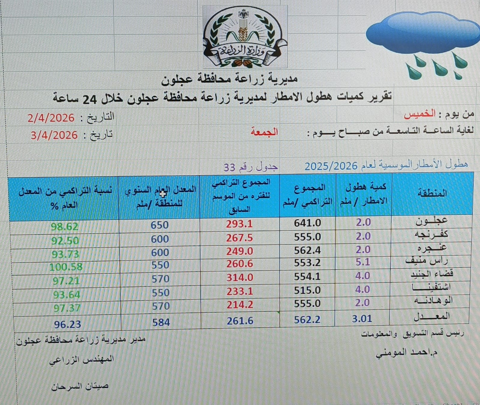 عجلون الإخبارية : بلغت كميات الامطار التي هطلت على محافظة عجلون منذ بداية الموسم المطري وحتى مساء يوم أمس الأول كما يلي : عجلون 641 ملم وكفرنحة 555 ملم وعنحره 562 ملم ورأس منيف 553 ملم وقضاء صخره 554ملم واشتفينا 515 ملم والوهادنه 555 ملم في الوقت الذي بلغ فيه المعدل التراكمي (584 ملم ) بنسبة 96,32% . وقال مدير زراعة المحافظة المهندس صيتان السرحان