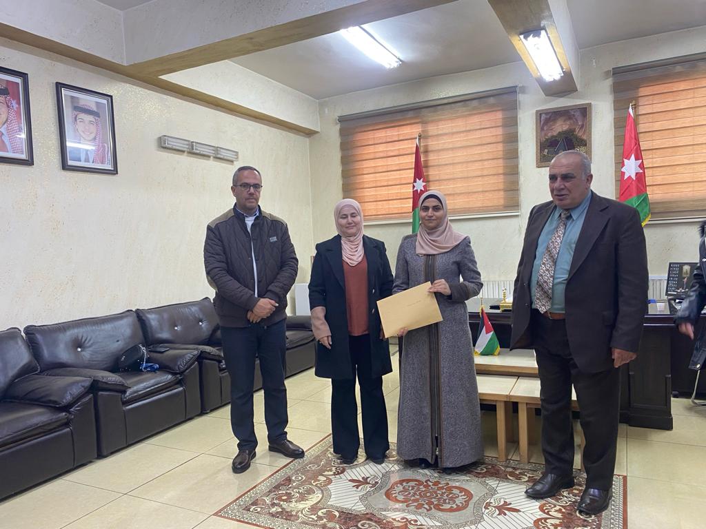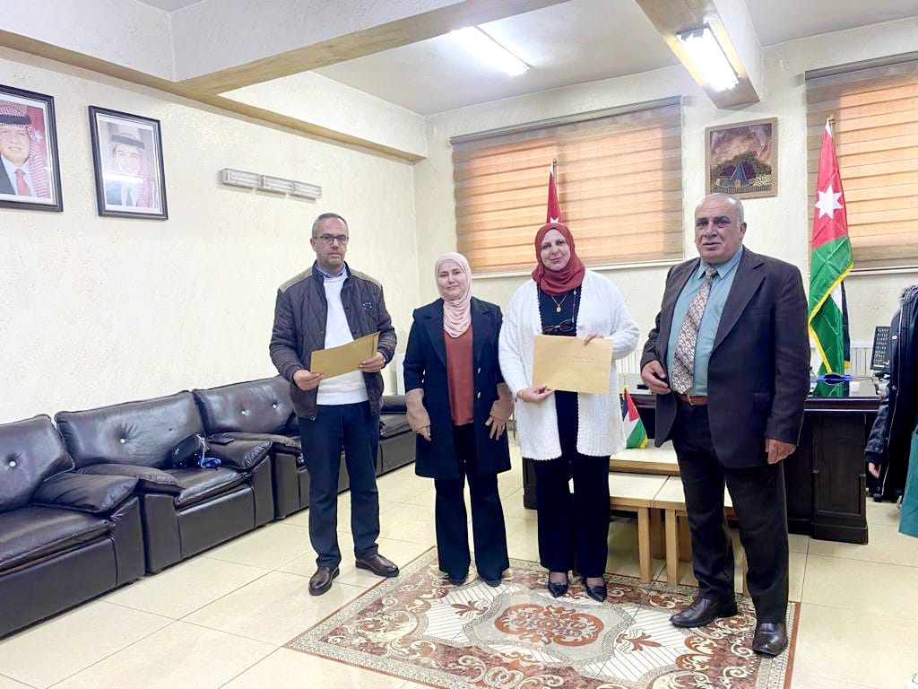 كرم مدير التربية والتعليم لمحافظة عجلون الأستاذ أسعد الشرع في مكتبه مديرة مدرسة عبين عبلين الثانوية للبنات بتول المومني والمعلمة عفاف هناندة والطالبة بيلسان المومني لفوزها بمسابقة الرسم الوطنية وتأهلها على مستوى الإقليم لمحافظة عجلون.