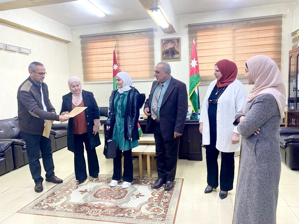 كرم مدير التربية والتعليم لمحافظة عجلون الأستاذ أسعد الشرع في مكتبه مديرة مدرسة عبين عبلين الثانوية للبنات بتول المومني والمعلمة عفاف هناندة والطالبة بيلسان المومني لفوزها بمسابقة الرسم الوطنية وتأهلها على مستوى الإقليم لمحافظة عجلون.