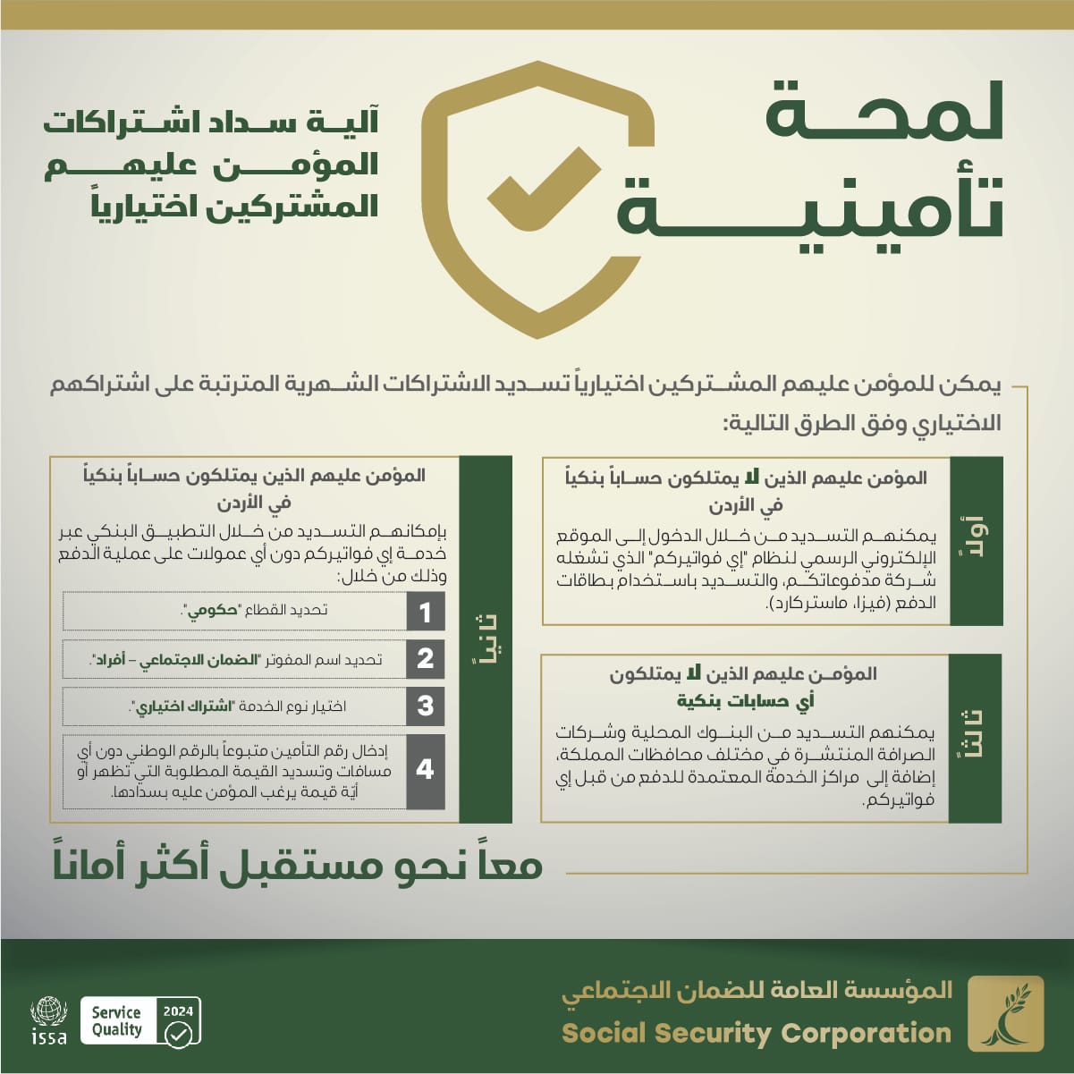 وبينت المؤسسة في بيان صحفي صادر عن مركزها الإعلامي أن المشترك اختيارياً الذي يمتلك حساباً بنكياً في الأردن بإمكانه تسديد دفعات اشتراكه الاختياري من خلال التطبيق البنكي عبر خدمة إي فواتيركم دون أي عمولات على عملية الدفع وذلك بتحديد القطاع “حكومي” ثم تحديد اسم المفوتر “الضمان الاجتماعي – أفراد” ثم اختيار نوع الخدمة “اشتراك اختياري” ومن ثم إدخال رقم التأمين متبوعاً بالرقم الوطني دون أي مسافات وتسديد القيمة المطلوبة التي تظهر أو أيّة قيمة يرغب المؤمن عليه بسدادها.