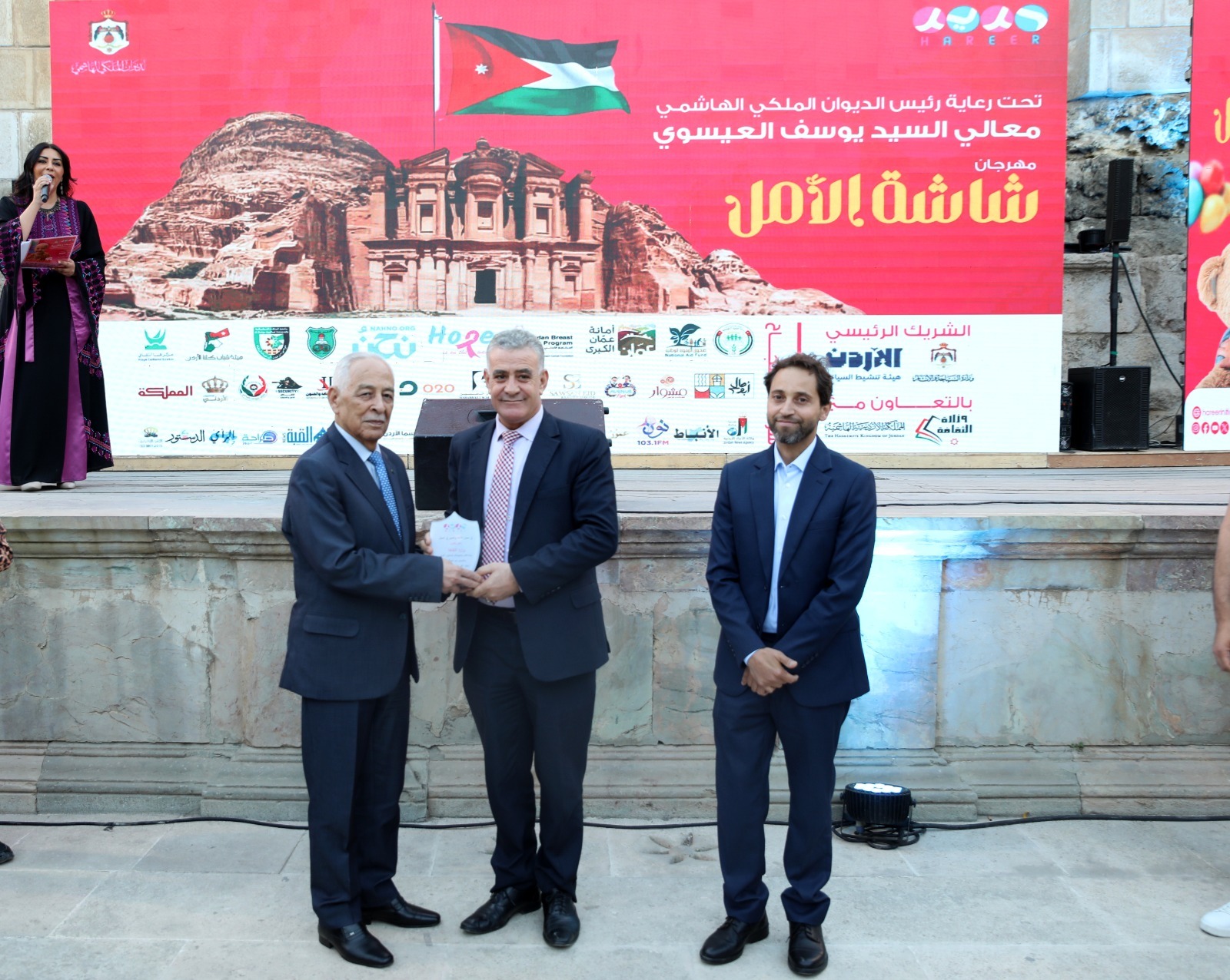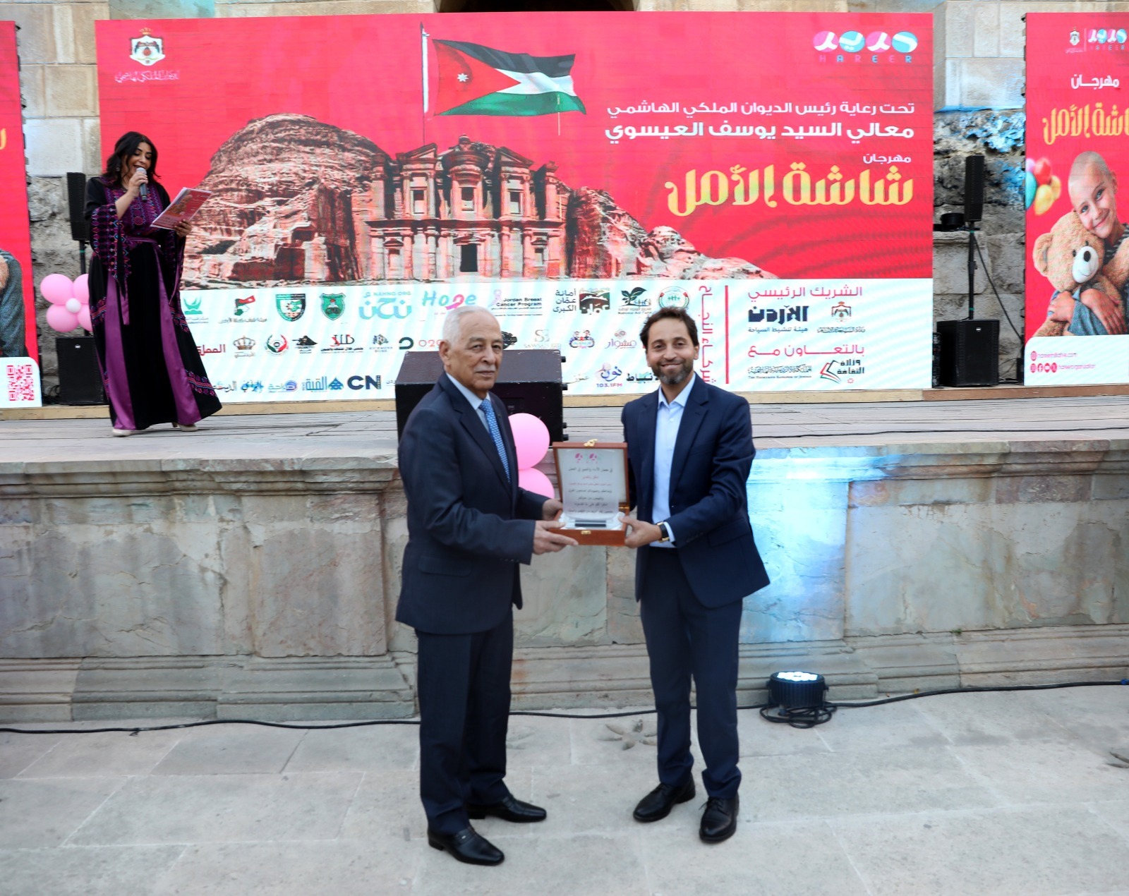 وفي ختام اللقاء، تم توجيه الشكر إلى جميع الداعمين والمتطوعين الذين أسهموا في إنجاح المبادرة، حيث كرم مدير عام المؤسسة نهاد الدباس راعي الحفل، رئيس الديوان الملكي الهاشمي يوسف العيسوي، الذي تشرف بتسليم دروع تكريمية لوزارة السياحة والآثار ممثلة بأمينها العام يزن الخضير ولوزارة الثقافة ممثله بأمينها العام نضل العياصرة.
