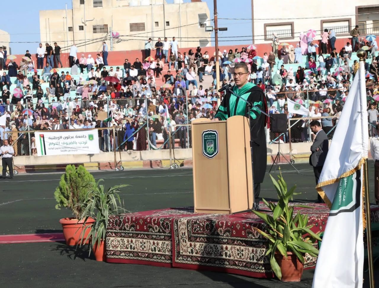 برعاية معالي وزير التعليم العالي والبحث العلمي الأستاذ الدكتور عزمي المحافظة، احتفلت جامعة عجلون الوطنية مساء الثلاثاء الموافق 16 أيلول 2025 بتخريج الفوج الثالث عشر من طلبتها “فوج النشامى”، في حفل مهيب أُقيم على ملعب إربد البلدي، وسط حضور رسمي وشعبي واسع من ذوي الطلبة والضيوف المدعوين.