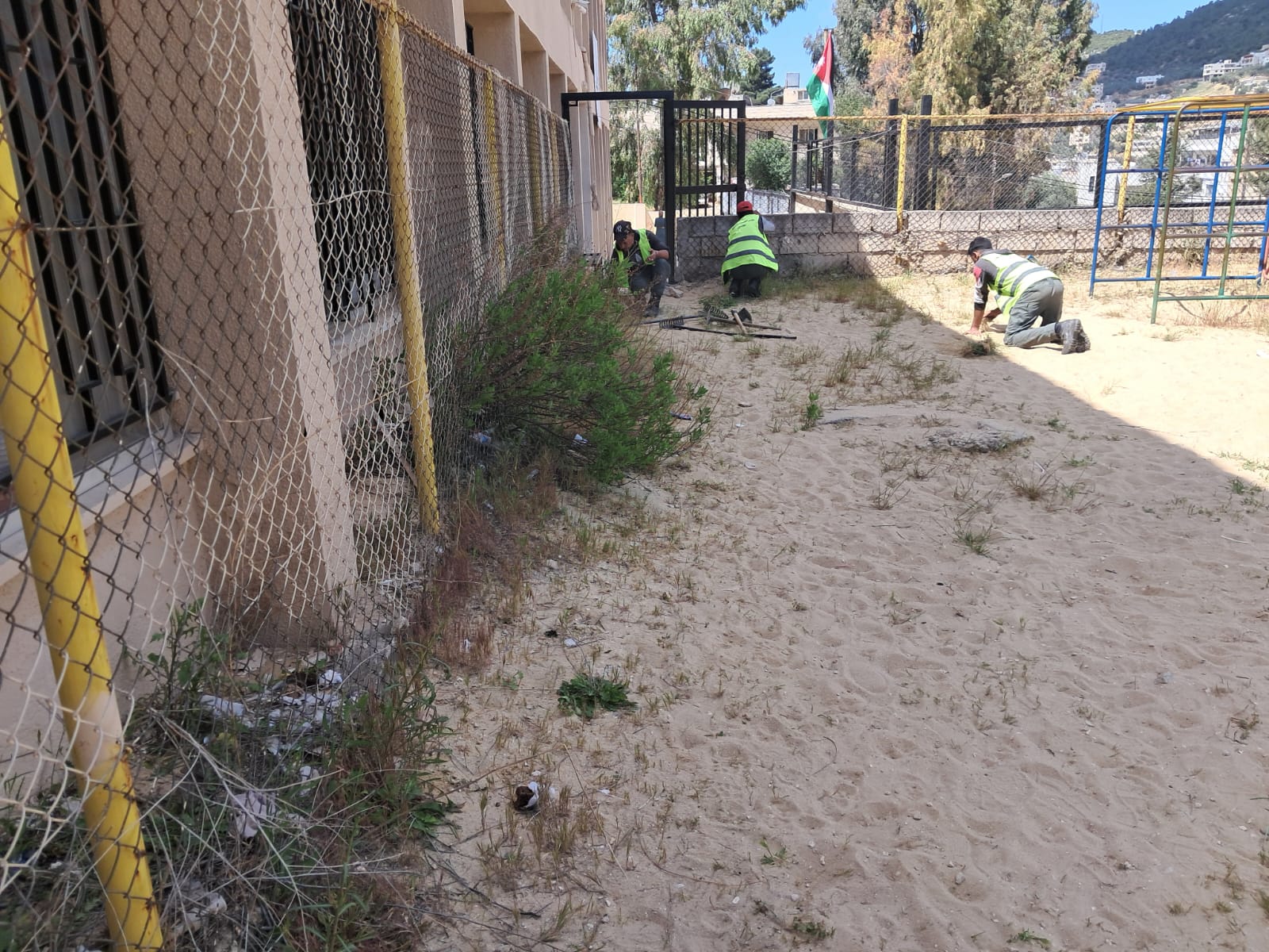 قام فر يق من مجلس الخدمات المشتركة / قسم البيئة والنظافة بإشراف المراقب الميداني خلدون المومني اليوم بتعشيب وتنظيف حديقة واحواض مدرسة عجلون الأساسية المختلطة وإزالة كافة ما بها من شوائب كالاشواك النفايات التي قد تؤثر على صحة وسلامة طلبة المدرسة ذات الفترتين