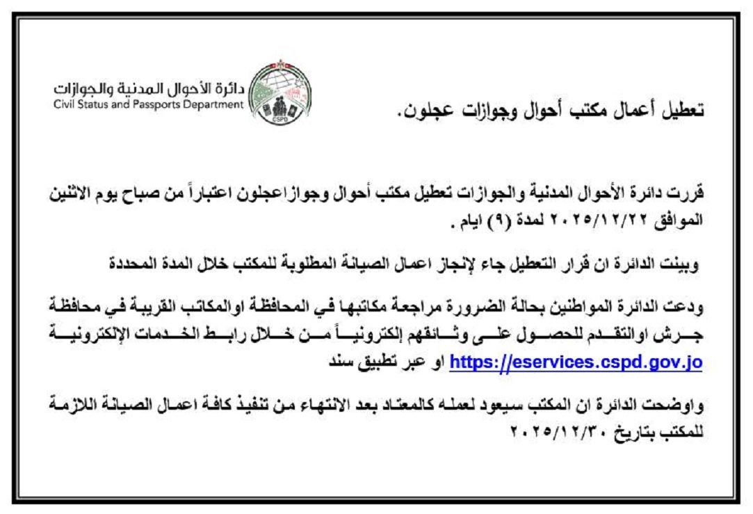 تعطيل أعمال مكتب أحوال وجوازت عجلون لإجراء أعمال صيانة في المكتبأخبار عجلونية في ديسمبر 21, 2025 أكمل القراءة شارك