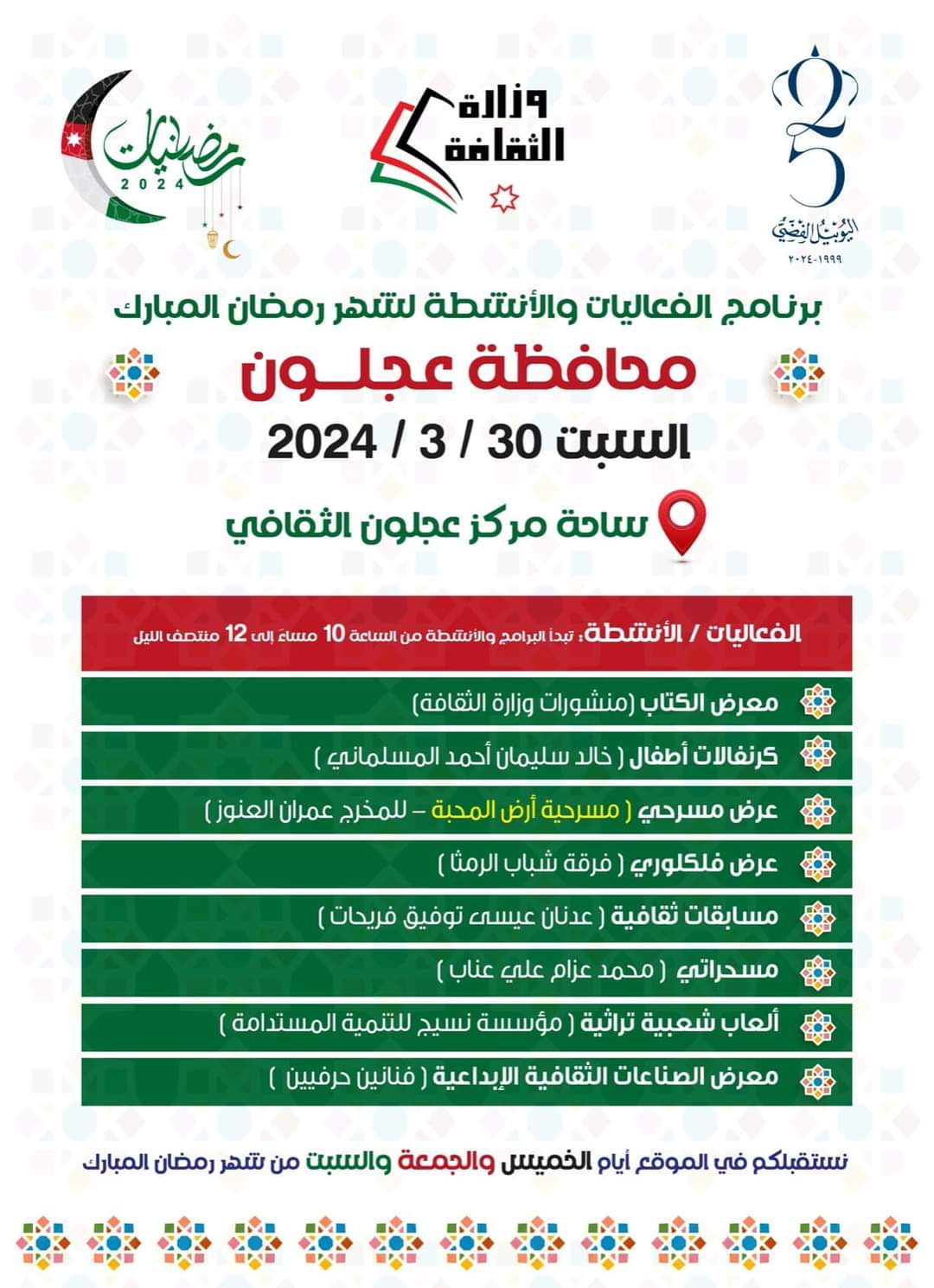 ويذكر أن فعاليات برنامج رمضانيات تقام في الساحة المقابلة لمركز عجلون الثقافي في نهاية كل أسبوع من شهر رمضان المبارك .