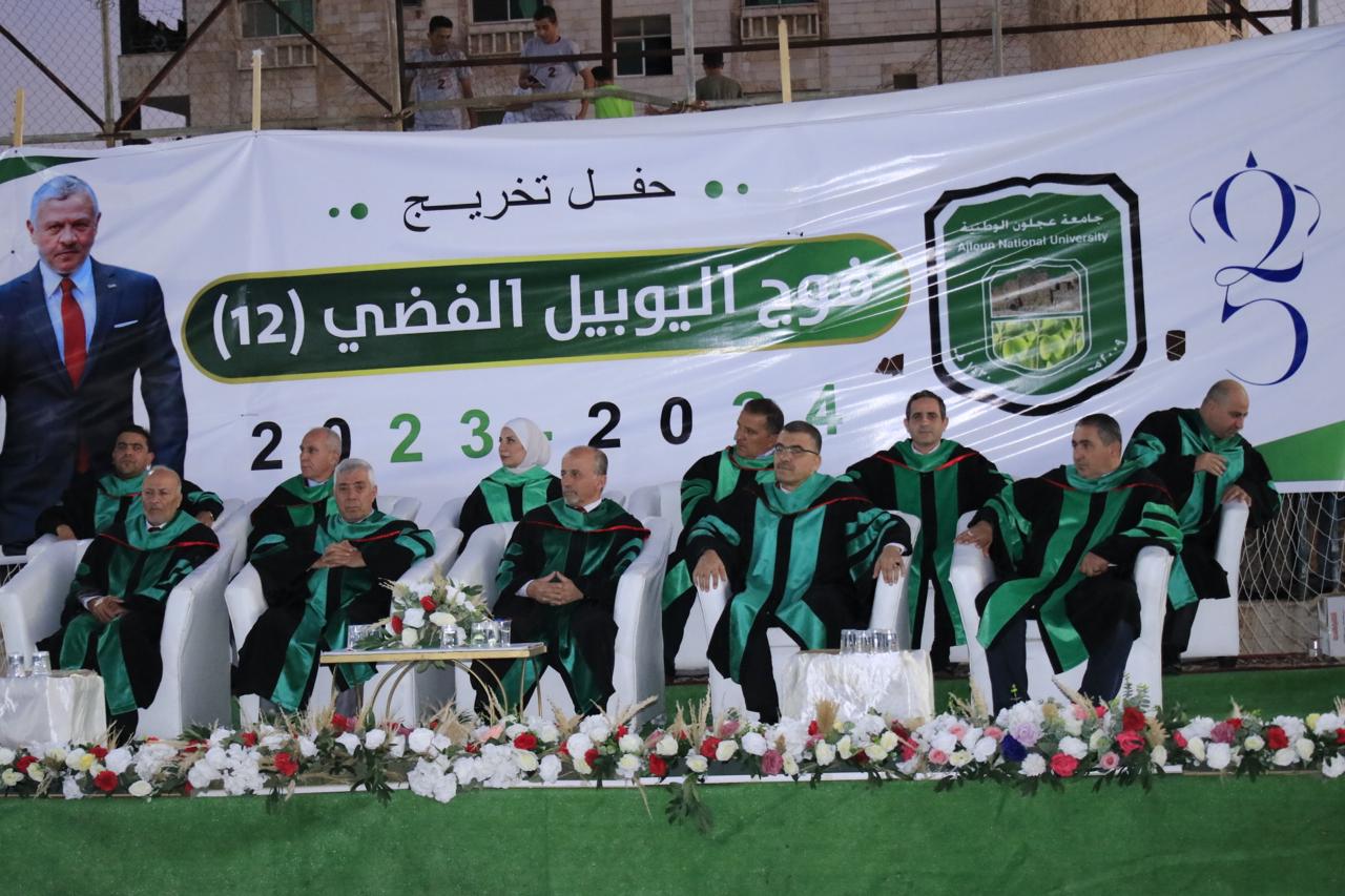 رعى رئيس مجلس أمناء جامعة عجلون الوطنية الدكتور محمد نور الصمادي حفل تخريج فوج (12) فوج اليوبيل الفضي للفصول الدراسية الأول والثاني والصيفي للأعوام (٢٠٢٣ /٢٠٢٤) من طلبتها في برامج البكالوريوس والماجستير والدبلوم العالي بحضور رئيس الجامعة الأستاذ الدكتور فراس الهنانده وعمداء الكليات والهيئتين التدريسية والإدارية في الجامعة وأولياء أمور الطلبة الخريجين .
