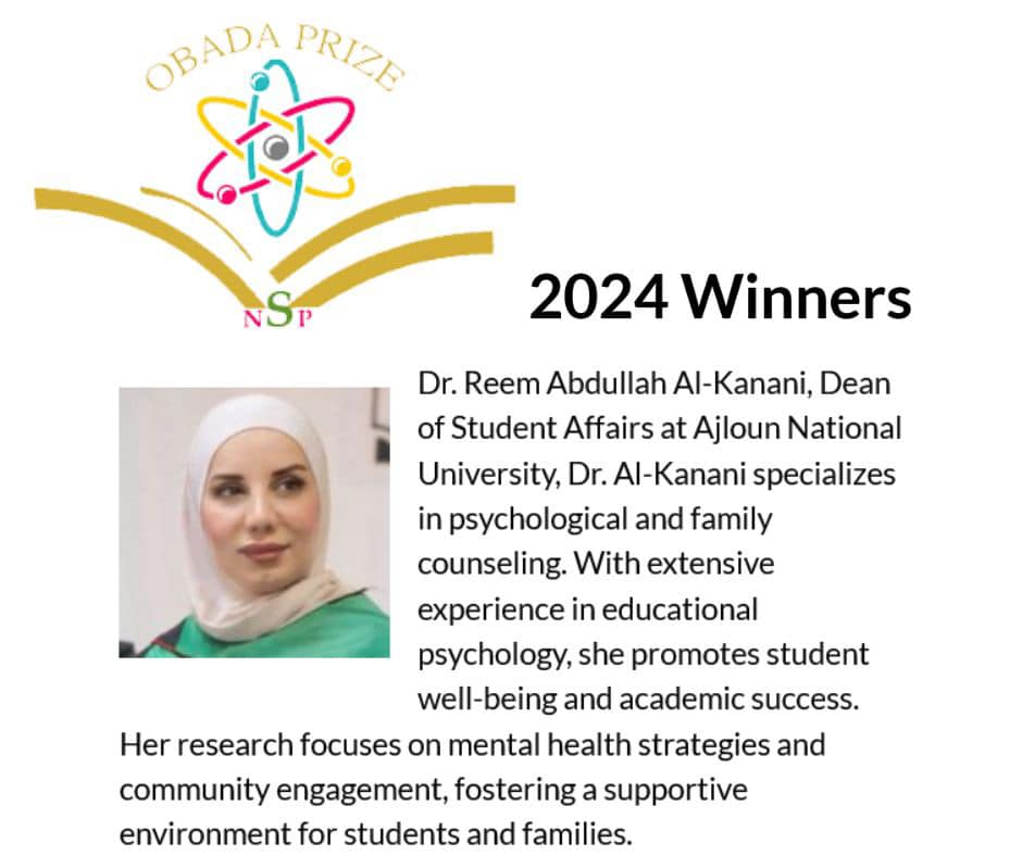 فازت جامعة عجلون الوطنية بجائزة عبادة العالمية لعام 2024م، في مجال النشاط البحثي والعلمي والعملي في العلوم الاجتماعية، وحصلت عليها عميد شؤون الطلبة الدكتورة ريم الكناني عن فئة الباحث المتميز.