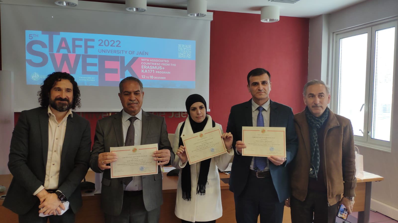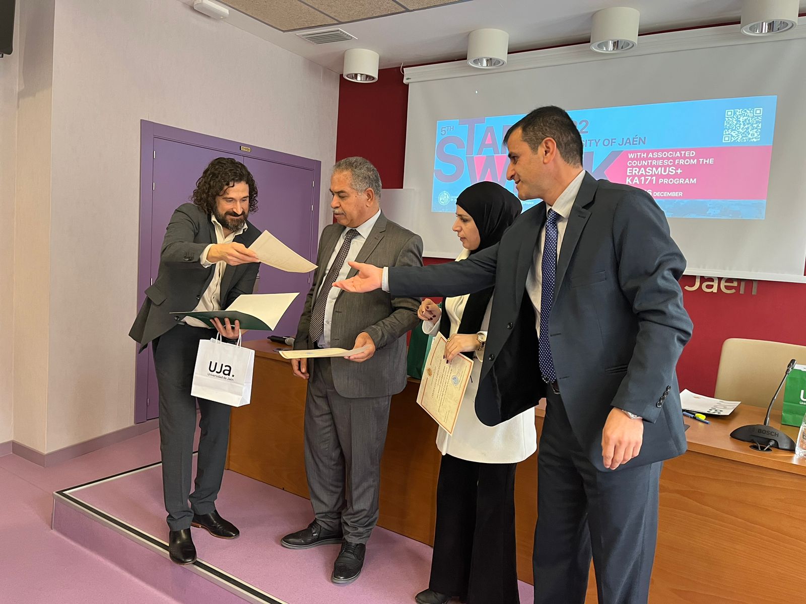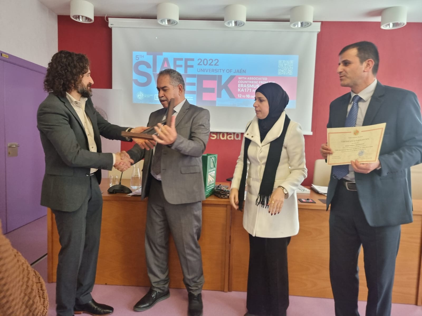 شارك الدكتور قاسم ابو عيد ، والدكتورة عبير الغزو، والدكتور خالد المومني بالاسبوع الدولي للتبادل التعليمي بين الموظفين من دول الاتحاد الأوروبي والدول خارج الاتحاد ضمن برنامج ايراسموس بلس في رحاب جامعة خايين – اسبانيا من ١٢ – ١٧ كانون اول ٢٠٢٢. حيث حصل المشاركون على شهادات تقديرية لمشاركتهم الفاعلة، كما قدموا هدية تذكارية لجامعة خايين الاسبانية – درع جامعة عجلون الوطنية- تجسيدا للتعاون بين الجامعتين .