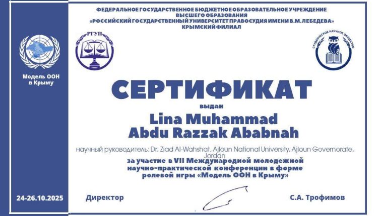 شاركت جامعة عجلون الوطنية ممثلةً بـ كلية الحقوق، وبإشراف عميد الكلية الدكتور زياد الوحشات، عن بُعد في أعمال المؤتمر الدولي السابع للشباب العلمي والعملي الذي انعقد بتاريخ 24 تشرين الأول 2025، التي نظمته جامعة العدل الروسية فرع القرم، تحت عنوان: “نحن نبني مستقبلنا معًا”، بمناسبة مرور ثمانين عامًا على تأسيس منظمة الأمم المتحدة.