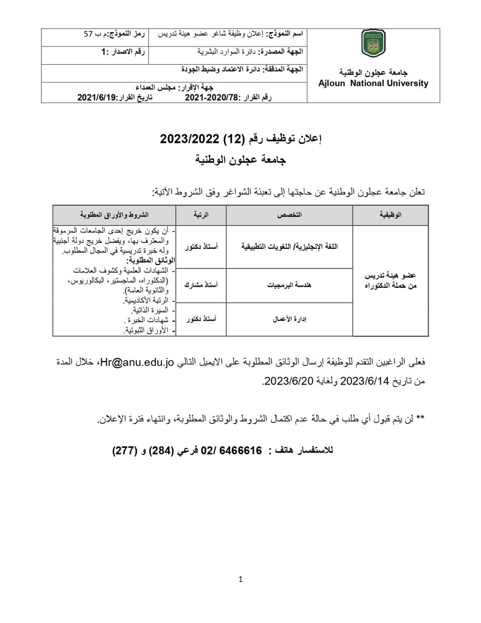 جامعة عجلون الوطنية تعلن حاجتها لاعضاء هيئة تدريس من حملة الدكتوراهأخبار جامعة عجلون الوطنيةأخبار عجلونية آخر تحديث يونيو 14, 2023 =أكمل القراءة شارك