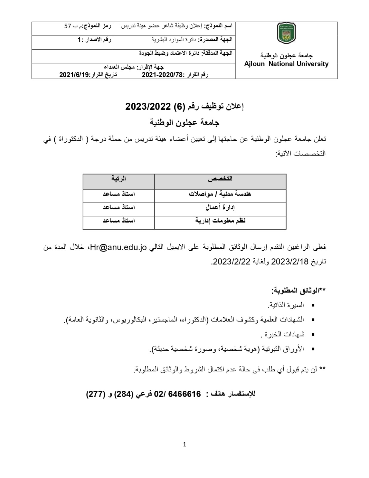 جامعة عجلون الوطنية تعلن عن حاجتها الى تعيين أعضاء هيئة تدريس في بعض التخصصاتأخبار عجلونية آخر تحديث فبراير 18, 2023 – قسم العلاقات العامة/ جامعة عجلون الوطنيةأكمل القراءة شارك