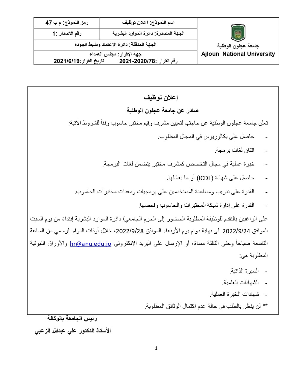 كما تعلن جامعة عجلون الوطنية عن حاجتها لتعيين مشرف وقيم مختبر