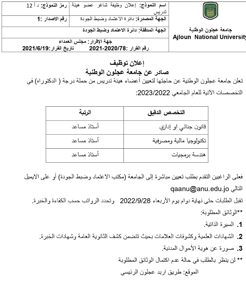 تعلن جامعة عجلون الوطنية عن حاجتها لتعيين أعضاء هيئة تدريس من حملة ( الدكتوراة ) في التخصصات الآتية للعام الجامعي 2022 / 2023