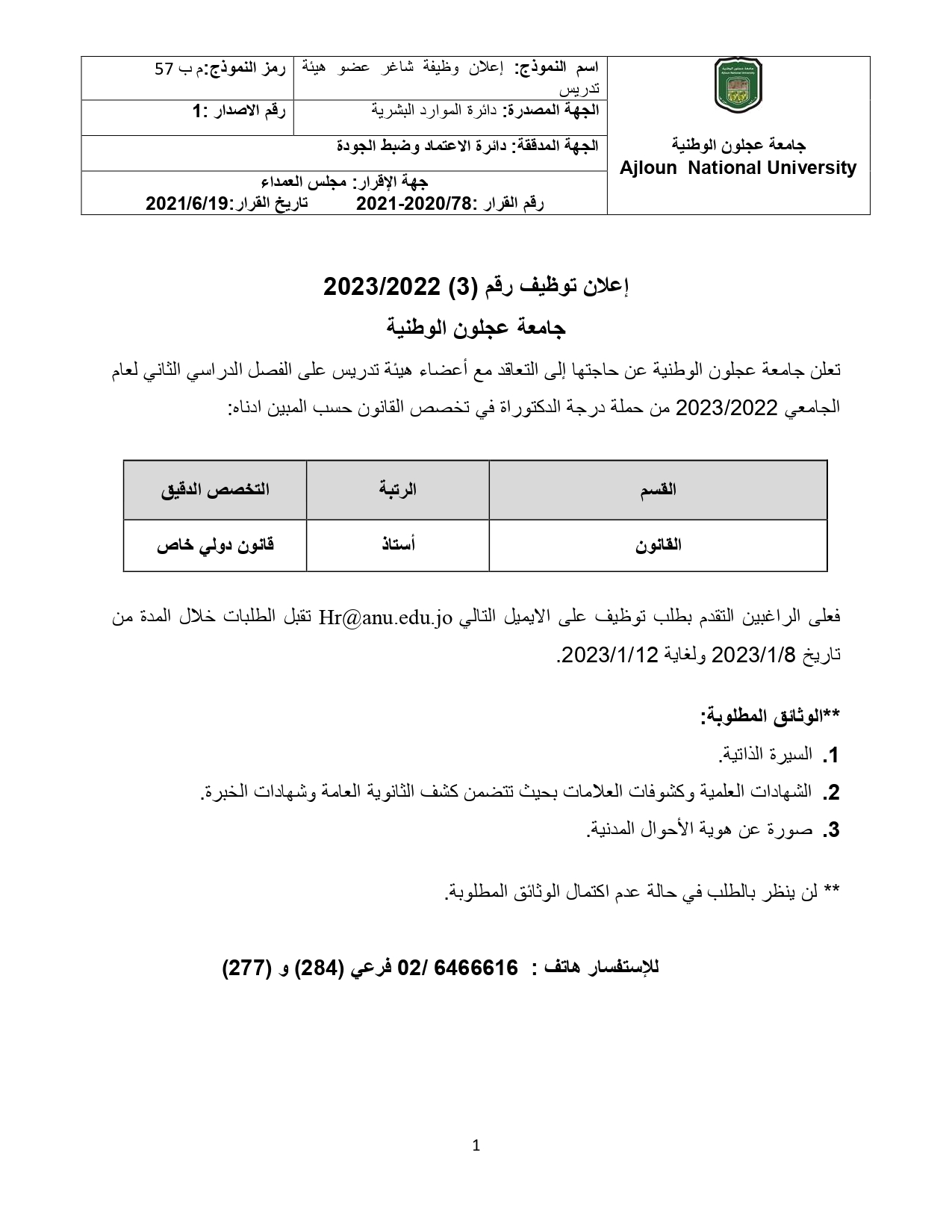 جامعة عجلون الوطنية تعلن عن حاجتها لتعيين أعضاء هيئة تدريسأخبار جامعة عجلون الوطنيةأخبار عجلونية في يناير 8, 2023 = أكمل القراءة شارك