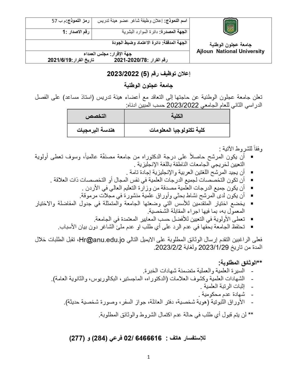 جامعة عجلون الوطنية تعلن عن حاجتها لتعيين أعضاء هيئة تدريس في كلية تكنولوجيا المعلوماتأخبار جامعة عجلون الوطنيةأخبار عجلونية في يناير 29, 2023 =أكمل القراءة شارك