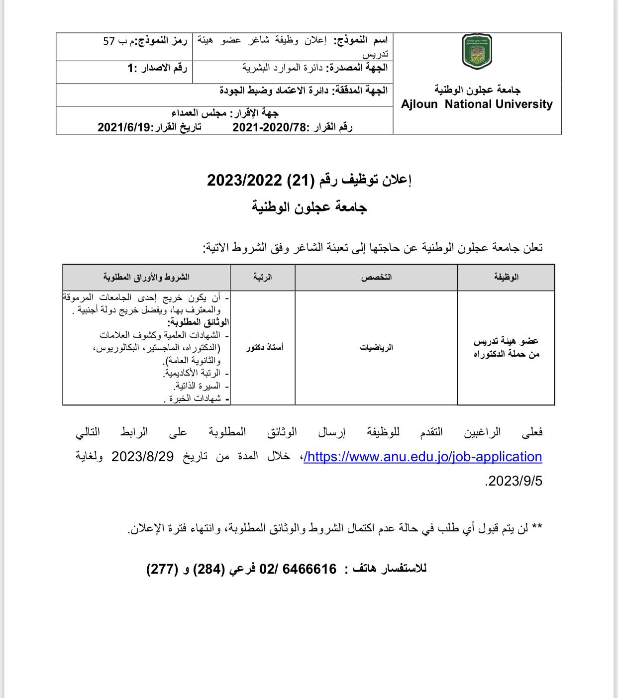 جامعة عجلون الوطنية تعلن عن حاجتها لتعيين عضو هيئة تدريس من حملة الدكتوراهأخبار جامعة عجلون الوطنيةأخبار عجلونية في أغسطس 30, 2023 =أكمل القراءة شارك