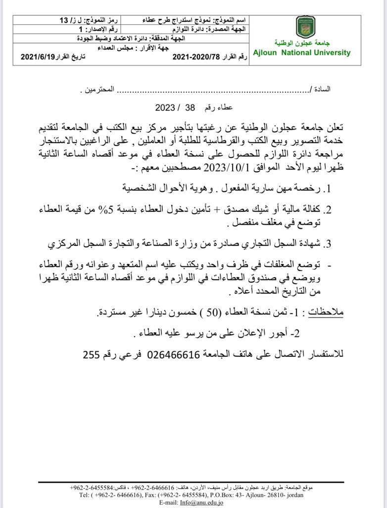 جامعة عجلون الوطنية تعلن عن طرح عطاء تأجير مركز بيع الكتب في الجامعةأخبار جامعة عجلون الوطنيةأخبار عجلونية في سبتمبر 23, 2023 أكمل القراءة شارك