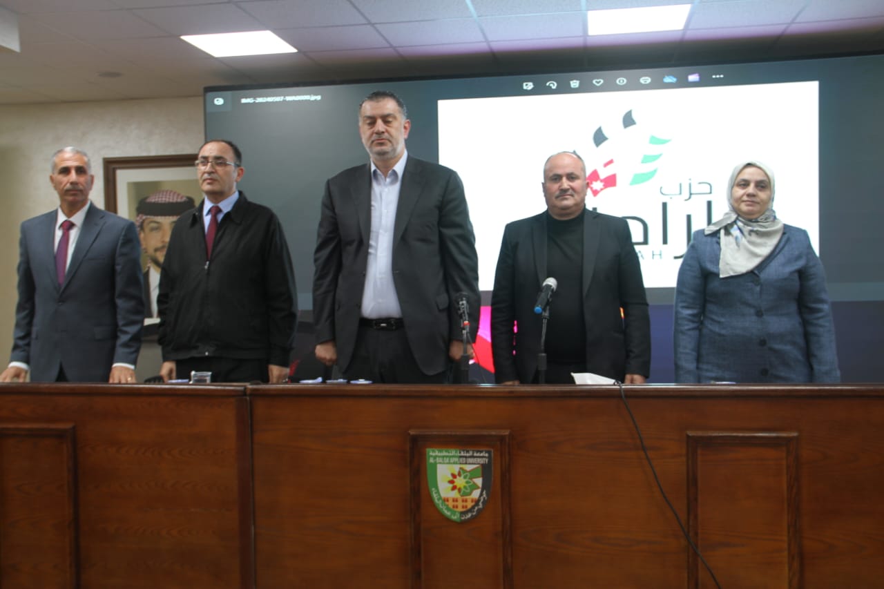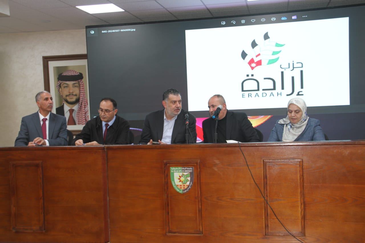 في البداية رحب عميد الكلية بمعالي أمين عام حزب إرادة السيد نضال البطاينه وأعضاء الحزب المرافقين له أجمل ترحيب بإسم عطوفة الأستاذ الدكتور أحمد فخري العجلوني رئيس جامعة البلقاء التطبيقية. وأكد الأستاذ الدكتور وائل الربضي ان كلية عجلون الجامعية كواحدة من كليات جامعة البلقاء التطبيقية تحرص دائما في نشاطاتها وفعالياتها لاستضافة الشخصيات الوطنية ويأتي ذلك ضمن سلسلة من اللقاءات السياسية الحزبية التي تُعقد في الكلية للمساهمة في زيادة الوعي الحزبي لدى أبناءنا الطلبة التي تؤكد على رؤى وتوجيهات جلالة الملك عبد الله الثاني المفدى على ضرورة تعميق مفهوم العملية الحزبية والانخراط بها .ليصبح العمل الحزبي عملاً منظماً وبشرائح واسعة ليساهم ذلك في إيجاد جيلٍ واعٍ قادر على المساهمة الفاعلة في عملية والارتقاء باردننا الغالي ،مؤكداًعلى أهمية الشباب ودورهم الفاعل في الحزبية والحياة السياسية .