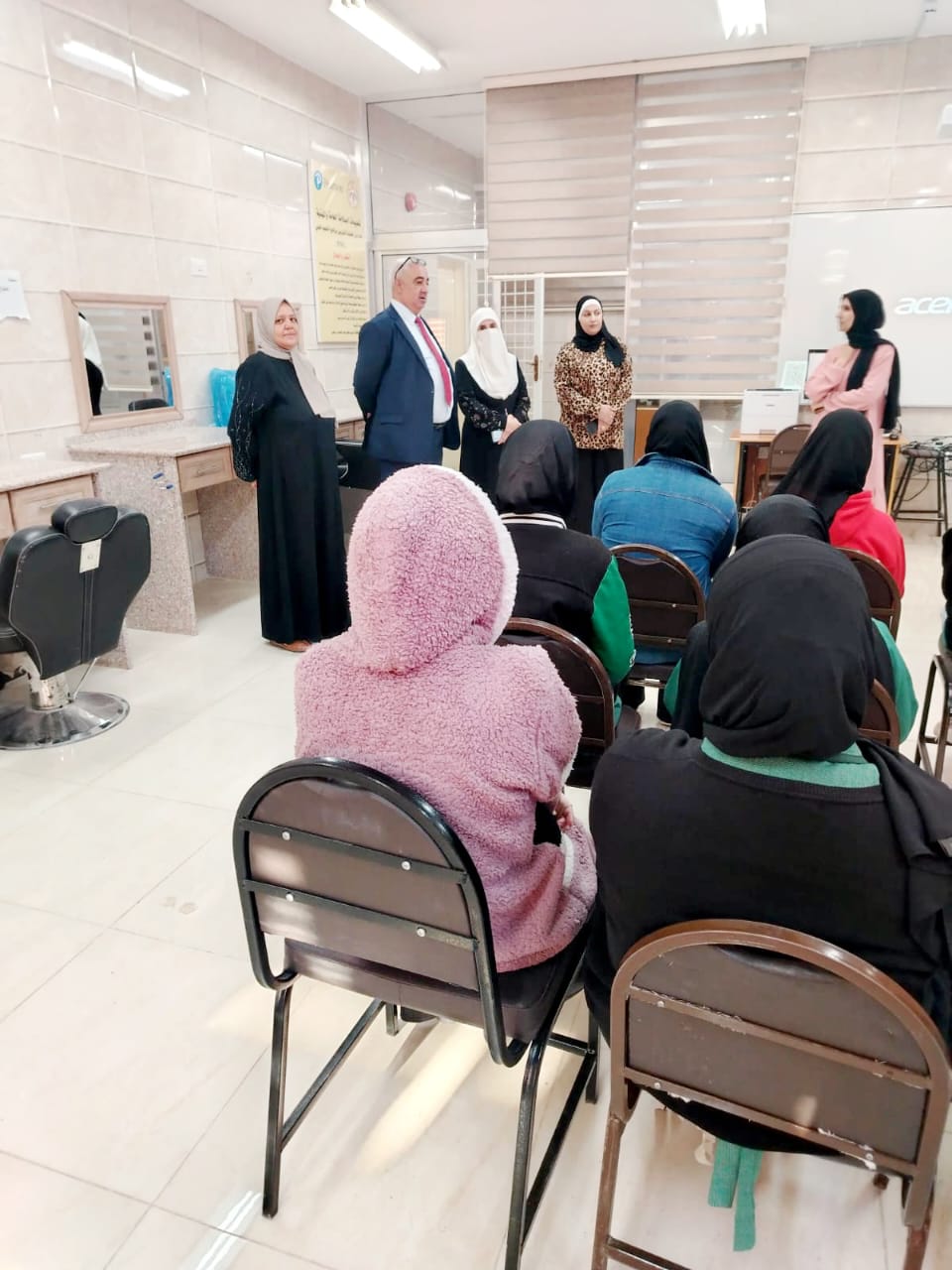 حيث زار جويعد مشاغل الشعر والجمال ومختبرات تكنولوجيا المعلومات واطلع على جاهزيتها من حيث توفر المواد والأدوات اللازمة لسير العملية التعليمية والتدريب العملي بكفاءة وحسب الخطة، والتقى الطالبات مشيرا إلى ضرورة الاستفادة من فرصة الالتحاق ببرنامج التعليم المهني والتقني BTEC وأهميته على الصعيد العملي و دوره الرئيسي في تنمية مهاراتهن العملية والتقنية بما يتلاءم ومتطلبات سوق العمل.