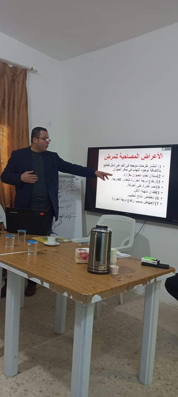 حيث قام المحاضر المهندس بسام بني عيسى بتعريف المزارعين بمرض الحمى القلاعيه والأعراض المصاحبه للمرض والأسباب المؤديه للمرض وطرق الوقاية والعلاج منه .