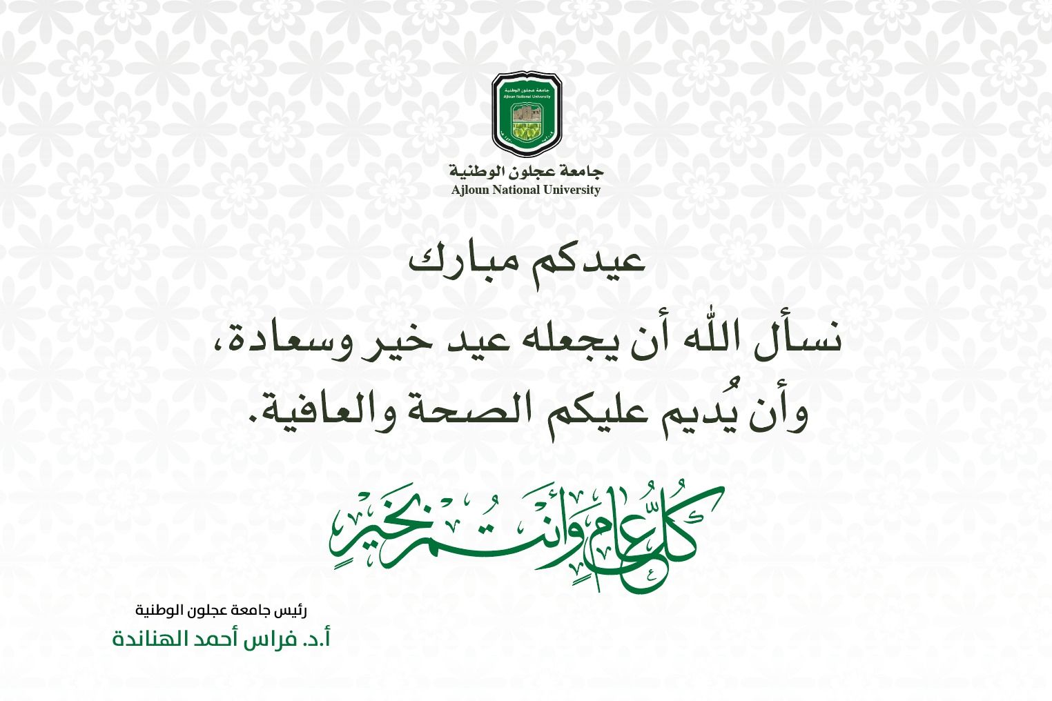 يتقدم الأستاذ الدكتور فراس الهناندة رئيس جامعة عجلون الوطنية بأحر التهاني والتبريكات إلى مقام حضرة صاحب الجلالة الهاشمية الملك عبدالله الثاني ابن الحسين المعظم وولي عهده الأمين صاحب السمو الملكي الأمير الحسين بن عبدالله الثاني والشعب الأردني العزيز والأمتين العربية والإسلامية وأسرة الجامعة من الهيئتين التدريسية والإدارية والطلبة بمناسبة عيد الفطر السعيد سائلاً المولى عز وجل أن يعيده على الجميع بالخير واليمن والبركات وعلى أردننا الغالي بمزيد من التقدم والازدهار في ظل القيادة الهاشمية الحكيمة