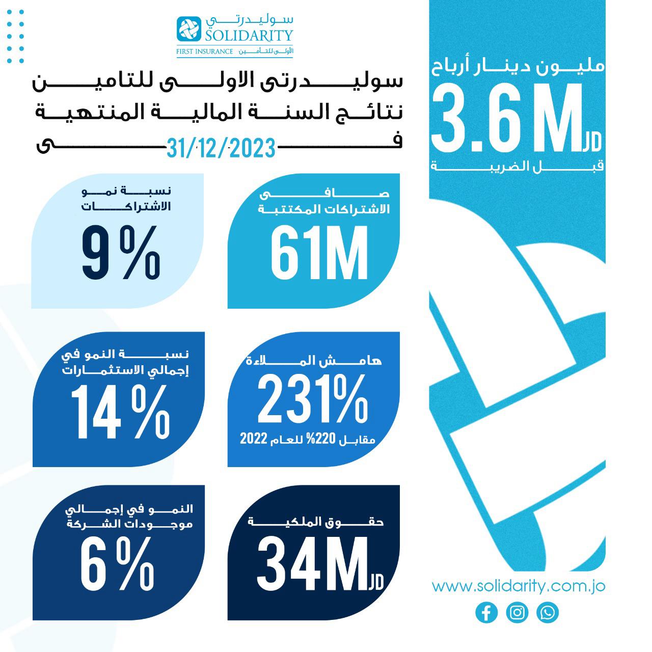 3.6 مليون دينار أردني أرباح “سوليدرتي” الشركة الأولى للتأمين (قبل الضريبة) عن عام 2023