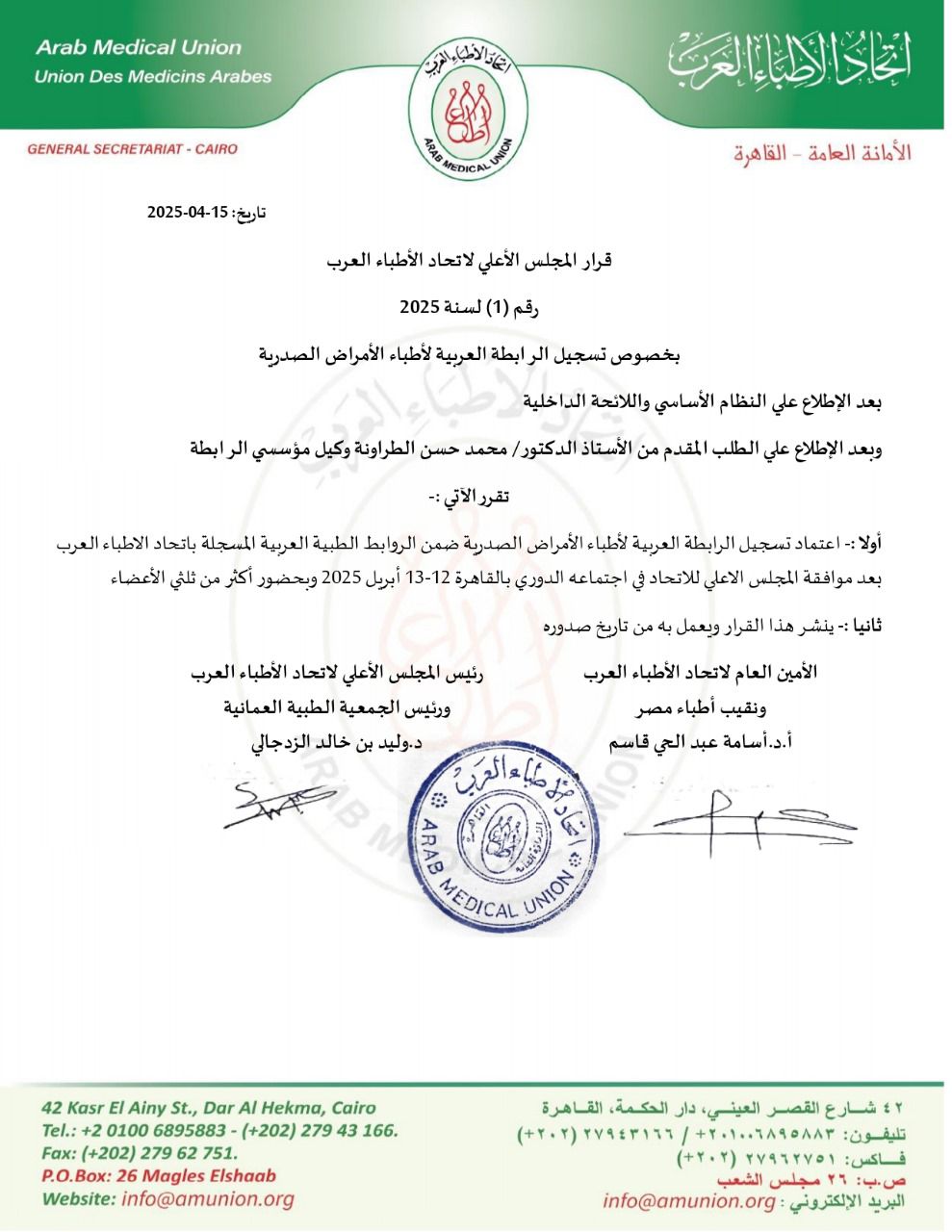 رسميا ..اتحاد الأطباء العرب يعتمد “الرابطة العربية لأطباء الأمراض الصدرية” وأمينها العام الطبيب الأردني الدكتور محمد حسن الطراونة