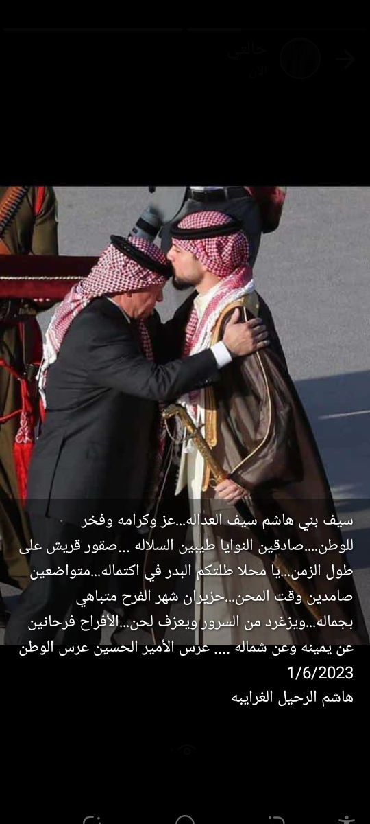 سيف بني هاشم سيف العداله…عز وكرامه وفخر للوطن….صادقين النوايا طيبين السلاله …صقور قريش على طول الزمن…يا محلا طلتكم البدر في اكتماله…متواضعين صامدين وقت المحن…حزيران شهر الفرح متباهي بجماله…ويزغرد من السرور ويعزف لحن…الأفراح فرحانين عن يمينه وعن شماله …. عرس الأمير الحسين عرس الوطن