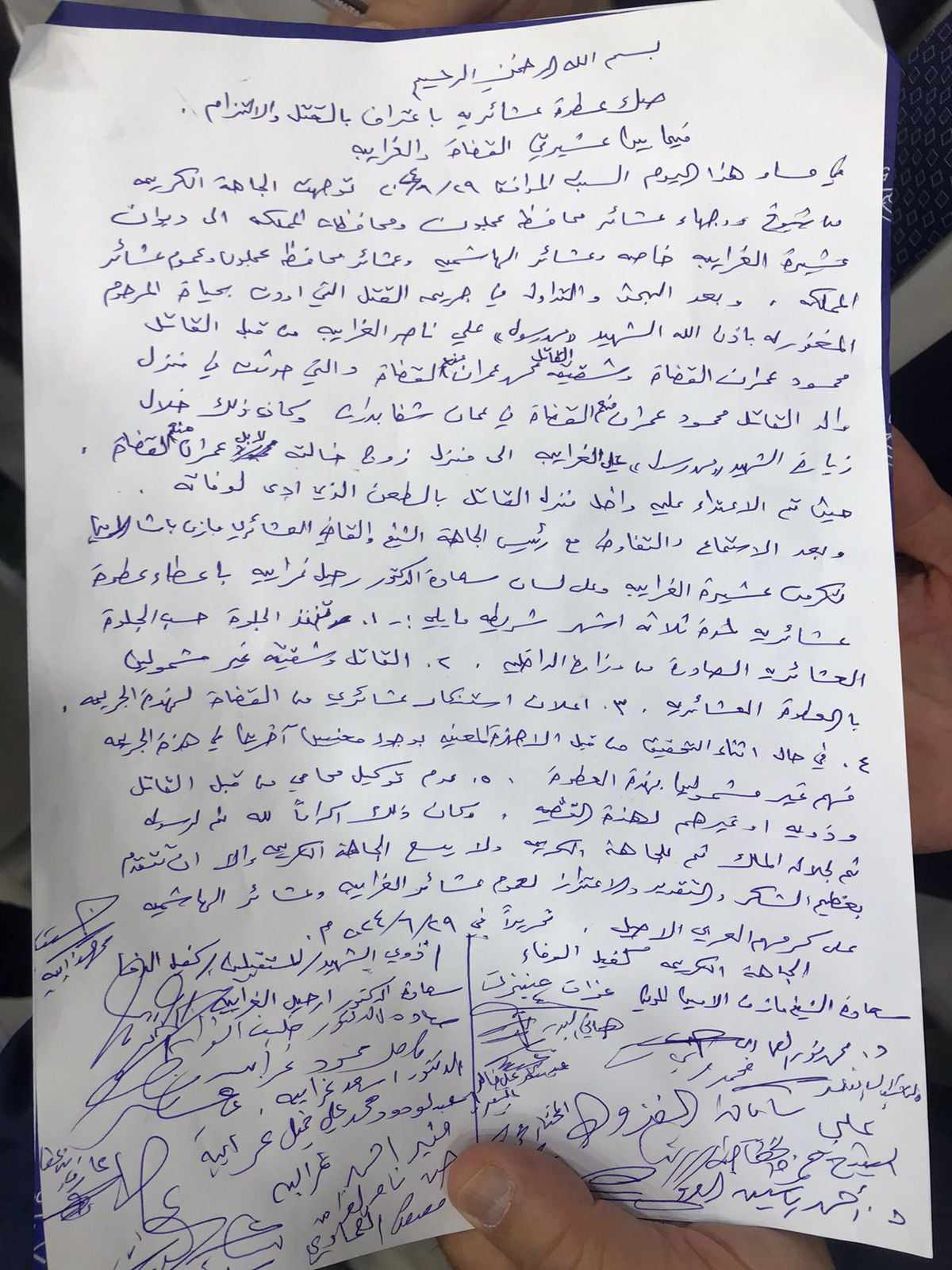 **إعلان استنكار عشائري من عشيرة القضاه لهذة الجريمة