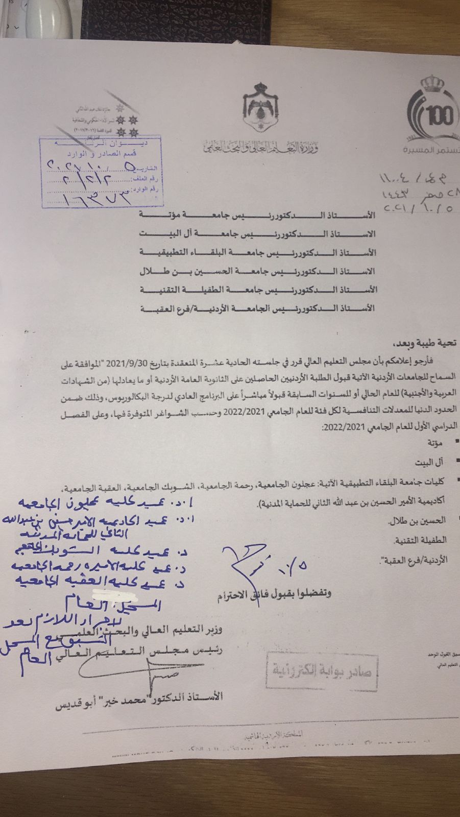 قرر مجلس التعليم العالي الموافقة على السماح للجامعات الأردنية الآتية قبول الطلبة الأردنيين الحاصلين على الثانوية العامة الأردنية أو ما يعادلها (من الشهادات العربية والأجنبية) للعام الحالي أو للسنوات السابقة قبولاً مباشراً على البرنامج العادي لدرجة البكالوريوس، وذلك ضمن الحدود الدنيا للمعدلات التنافسية لكل فئة للعام الجامعي 2021 / 2022 وحسب الشواغر المتوفرة فيها، وعلى الفصل الدراسي الأول للعام الجامعي 2021 / 2022: