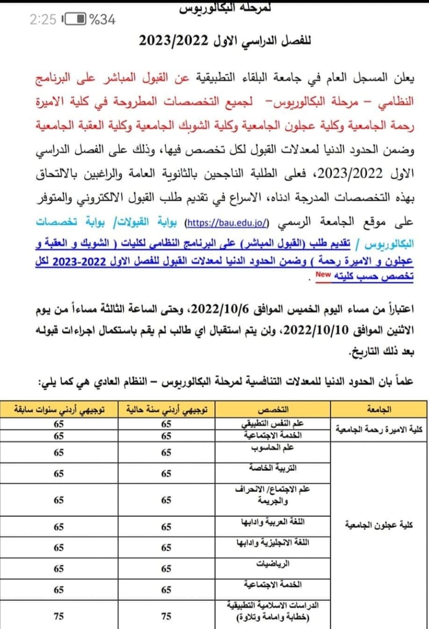 فتح باب القبول المباشر في كلية عجلون الجامعية وكليات أخرىأخبار عجلونية آخر تحديث أكتوبر 7, 2022 = أكمل القراءة شارك