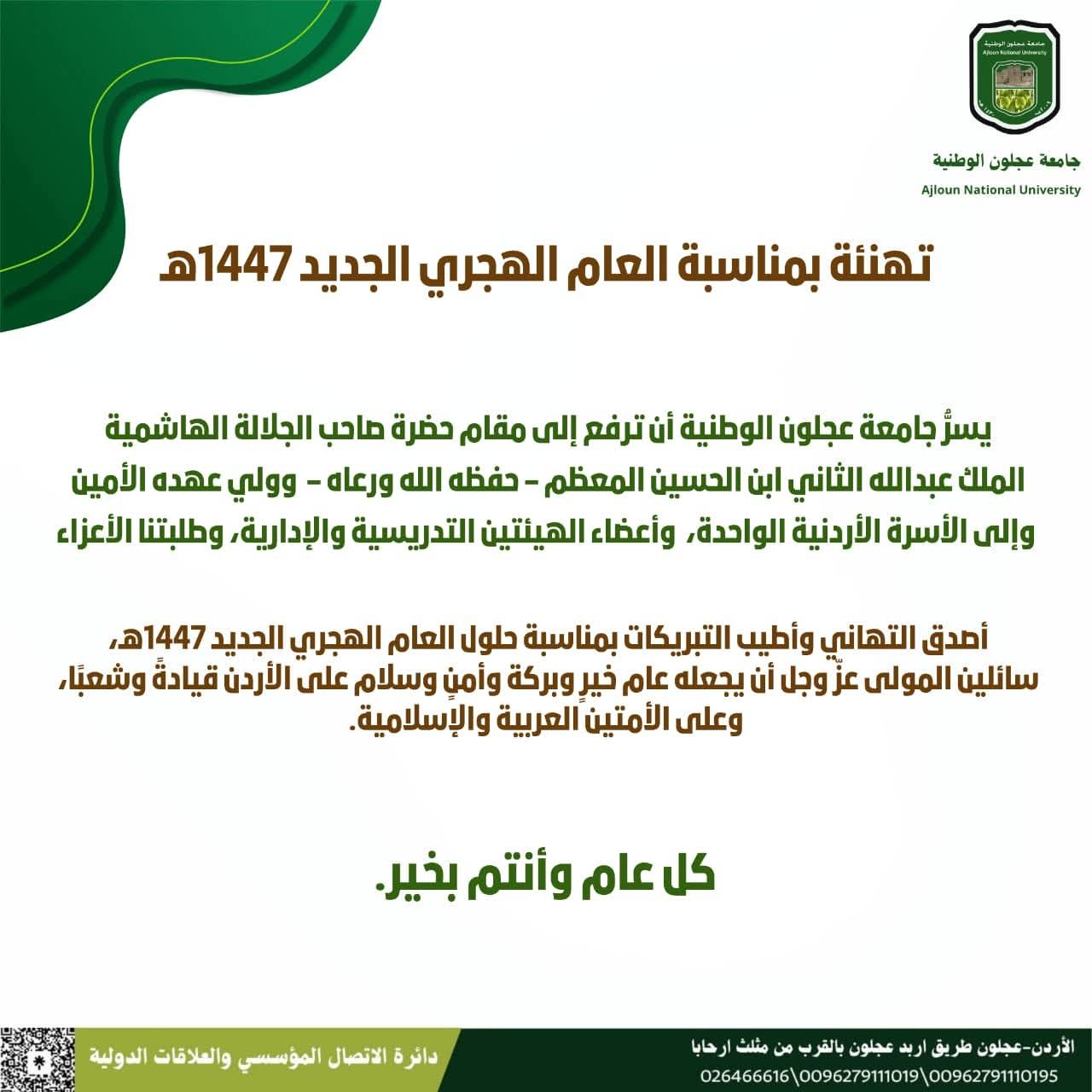 يسر جامعة عجلون الوطنية أن ترفع أسمى آيات التهنئة والتبريك إلى مقام حضرة صاحب الجلالة الهاشمية الملك عبدالله الثاني ابن الحسين المعظم – حفظه الله ورعاه – وسمو ولي عهده الأمين الأمير الحسين بن عبدالله الثاني – حفظه الله – وإلى الأسرة الأردنية الواحدة، وإلى الأمتين العربية والإسلامية، بمناسبة حلول العام الهجري الجديد 1447هـ، سائلةً الله العلي القدير أن يعيده على الأردن والأمة جمعاء بالخير واليمن والبركات.