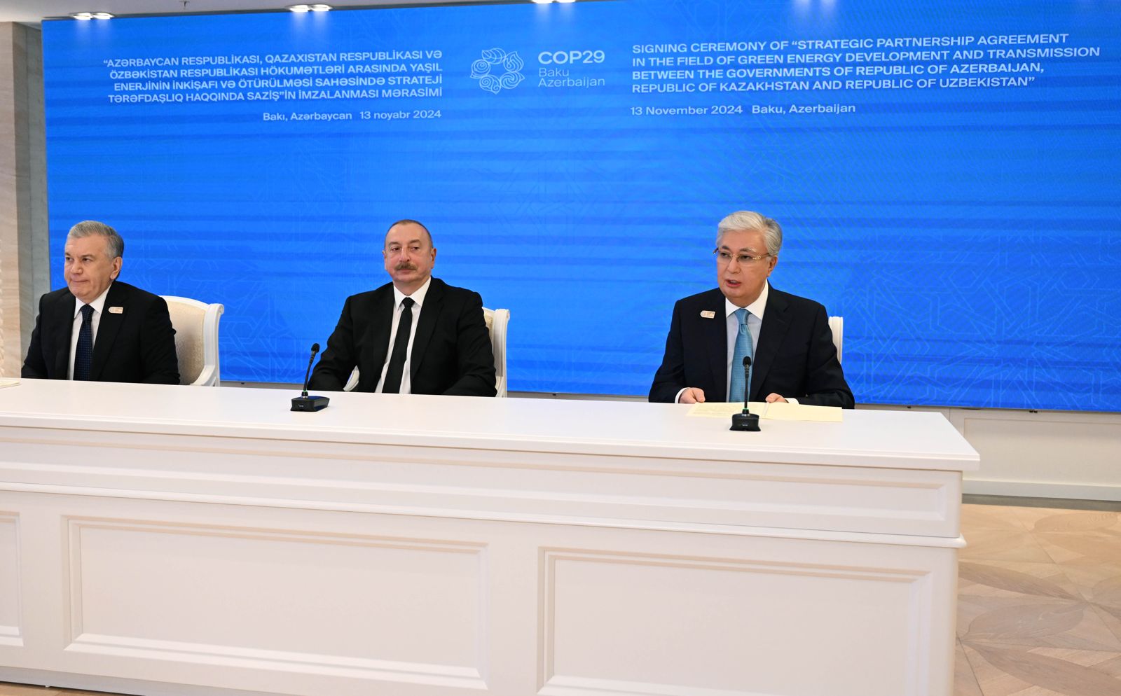 أستانا – باكو: وقع رؤساء كازاخستان وأذربيجان وأوزبكستان، قاسم جومارتتوكاييف وإلهام علييف وشوكت ميرزيوييف، اتفاقية شراكة استراتيجية بشأن تكامل أنظمة وإنتاج ونقل الطاقة الخضراء في البلدان الثلاثة، وذلك على هامش قمة المناخ العالمية COP 29 التي انعقدت في باكو عاصمة أذربيجان، فيما أكد الرئيس توكاييف بأن الطاقة “الخضراء” تشكل أولوية، والتوقيع صفحة جديدة في تاريخ الرغبة المشتركة في التنمية المستدامة.