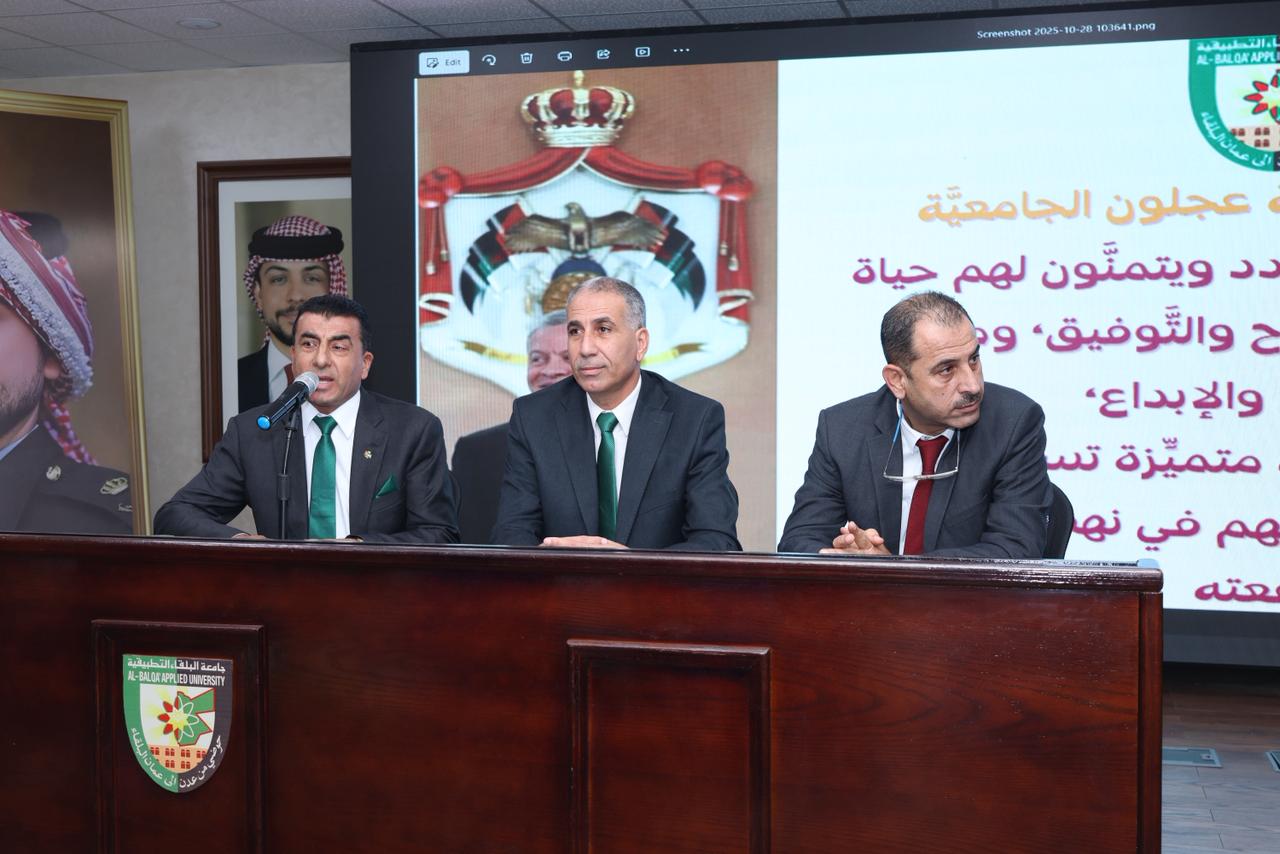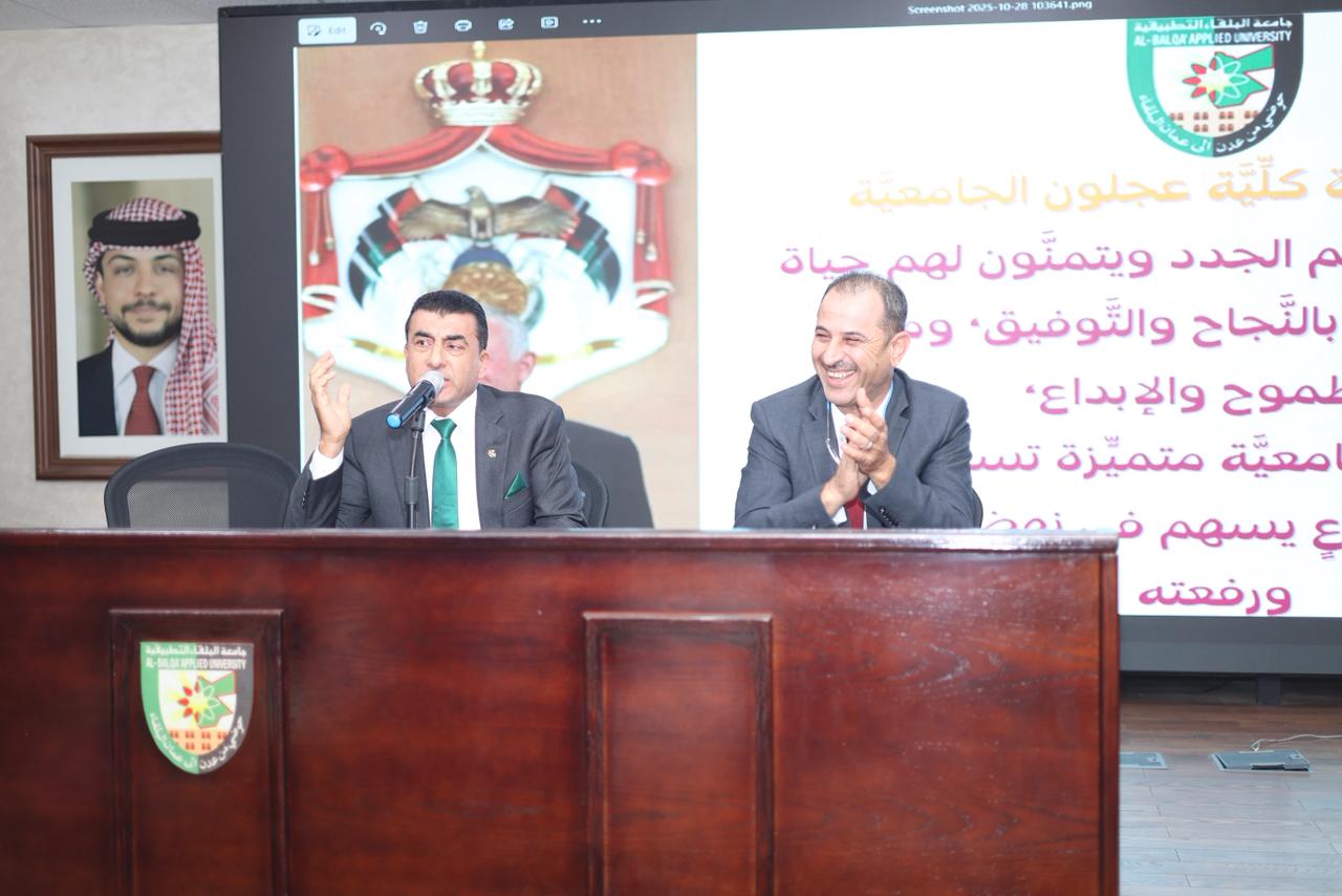 انطلاقًا من رؤية ورسالة جامعة البلقاء التطبيقية الهادفة إلى إعداد جيل واعٍ ومؤهل يسهم في مسيرة التنمية الوطنية، وبتوجيهات من عطوفة الأستاذ الدكتور أحمد فخري العجلوني رئيس الجامعة، رعى عميد كلية عجلون الجامعية الأستاذ الدكتور وائل الربضي حفل استقبال الطلبة المستجدين للعام الجامعي 2025/2026، والذي نظمه قسم الخدمات الطلابية والأنشطة في قاعة الشهيد محمد العزام.
