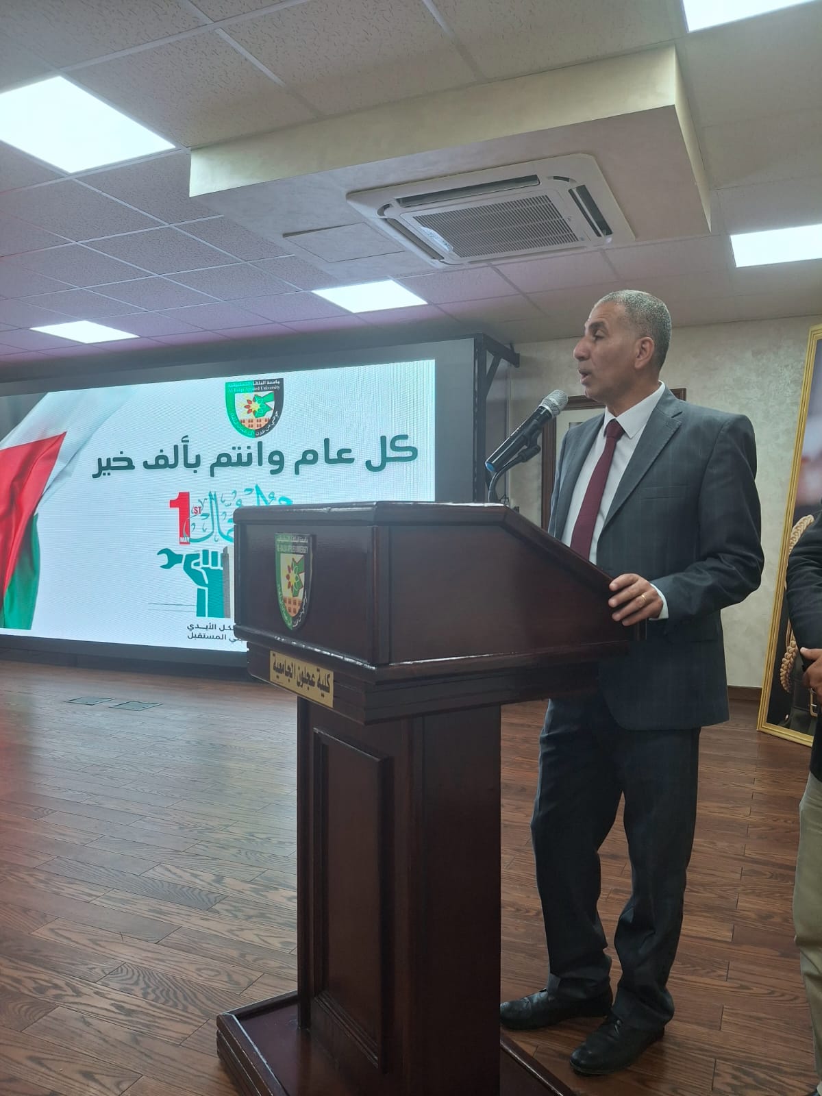 والقى الأستاذ الدكتور وائل الربضي، عميد الكلية، كلمة بهذه المناسبة، استهلها بالتأكيد على مقولة جلالة الملك الحسين بن طلال طيب الله ثراه : “الإنسان أغلى ما نملك”، معبرًا عن اعتزازه بكافة العاملين في الكلية. ووجّه شكره وتقديره لأعضاء الهيئتين الأكاديمية والإدارية، ولجميع العاملين من عمال الوطن، على ما يبذلونه من جهود مخلصة ومتواصلة في سبيل رفعة الكلية وتقدمها، مشيدًا بدورهم المحوري في الحفاظ على بيئة تعليمية متكاملة، تعكس صورة حضارية تليق بصرح أكاديمي متميز.