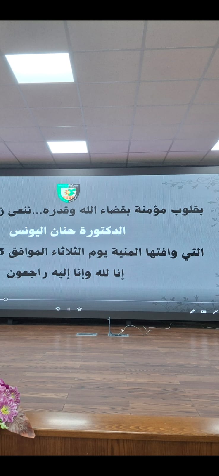 وقد نظمت الكلية لقاء تأبينيًا مهيبًا وفاءً لذكراها وتكريمًا لمسيرتها الطيبة، بحضور عميد الكلية الأستاذ الدكتور وائل الربضي، وجمع من أعضاء الهيئتين الأكاديمية والإدارية، الذين اجتمعوا لاستحضار ما قدمته الفقيدة خلال سنوات من العطاء في خدمة الكلية وطلبة الكلية .