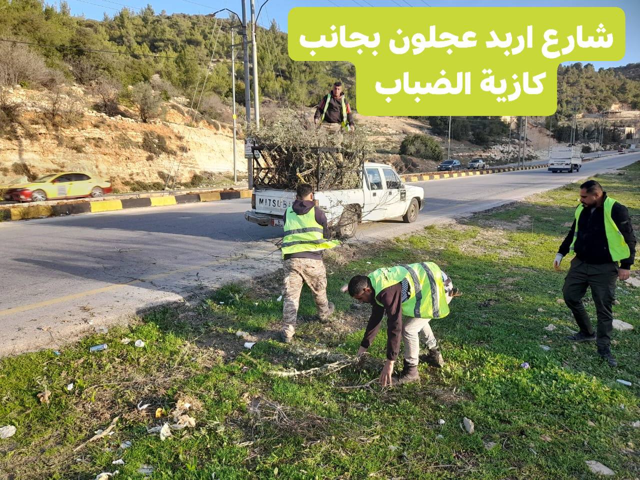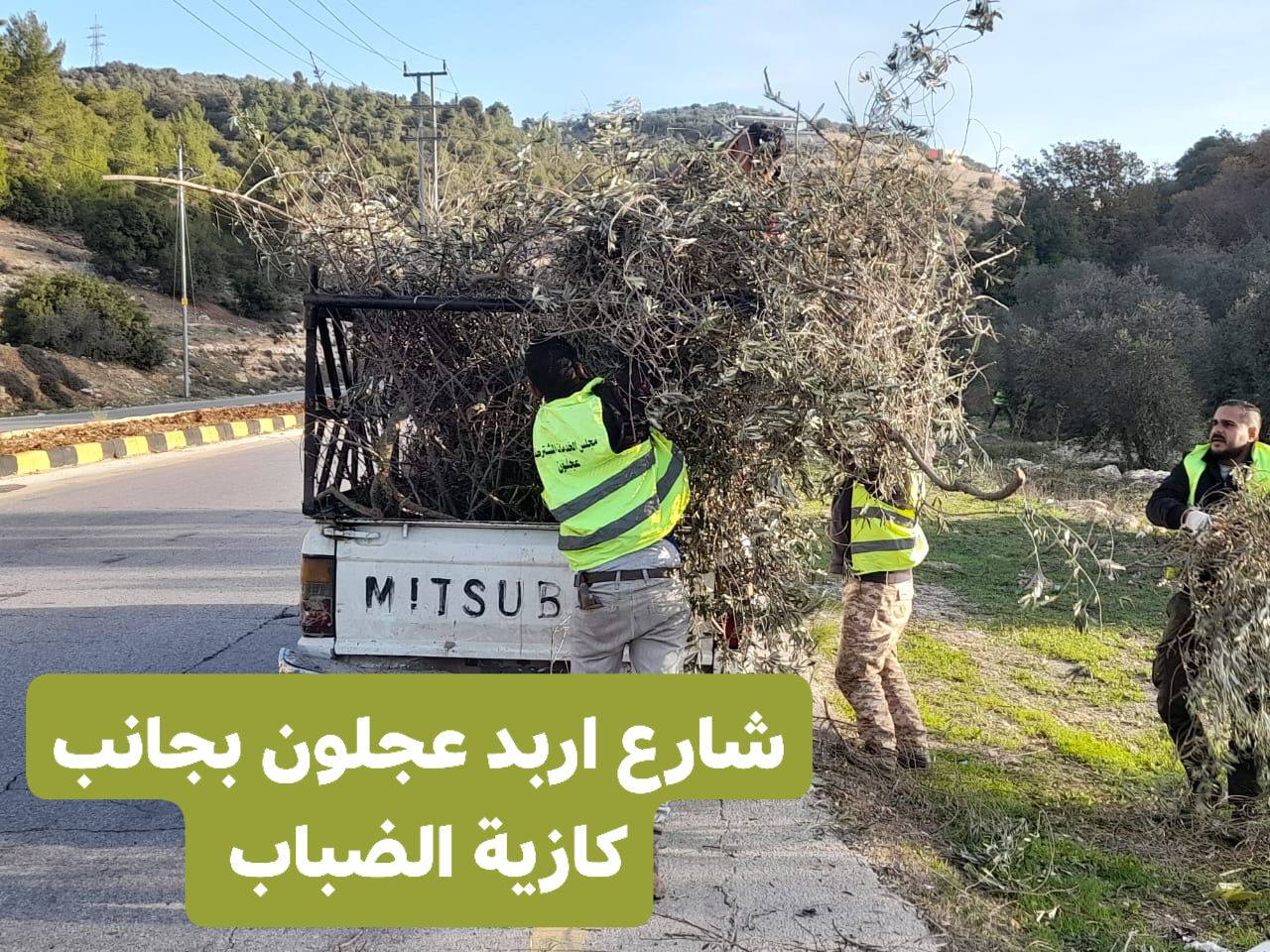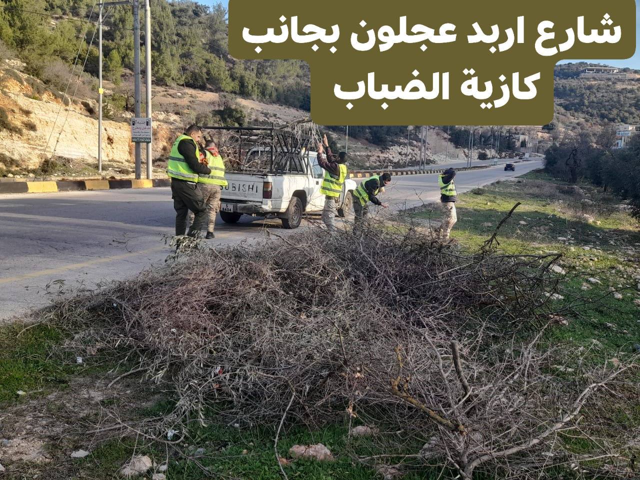 فريق عمل على شارع اربد عجلون بجانب كازية الضباب لازالة بعض مخلفات الأشجار على جوانب الطرق و فريق عمل على شارع سوف عين جنا لازالة مخلفات الأشجار من امام العبّارات