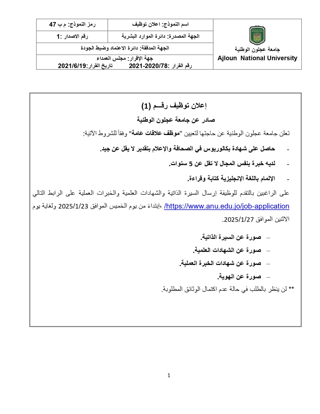 لعلان توظيف صادر عن جامعة عجلون الوطنيةأخبار جامعة عجلون الوطنيةأخبار عجلونية في يناير 22, 2025 =أكمل القراءة شارك