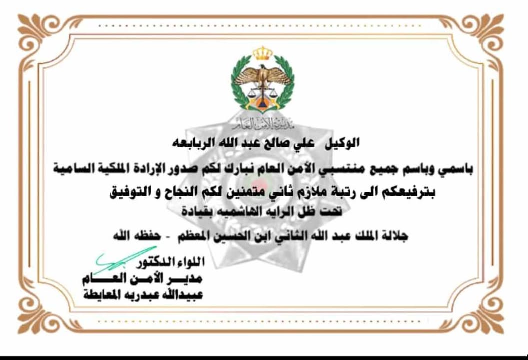تتقدم عشيرة الربابعة بالتهنئة والتبريك للعم صالح الربابعة ابو محمد بصدور الإرادة الملكية السامية بترفيع ابنه علي صالح الربابعة (أبو شهم ) الي رتبة ملازم /٢ في جهاز الامن العام /مديرية الدفاع المدني .