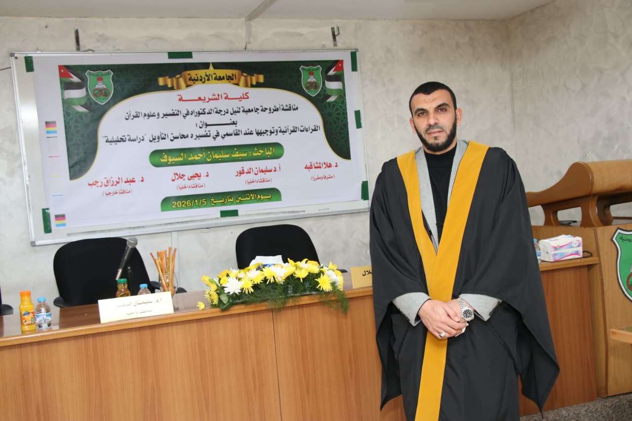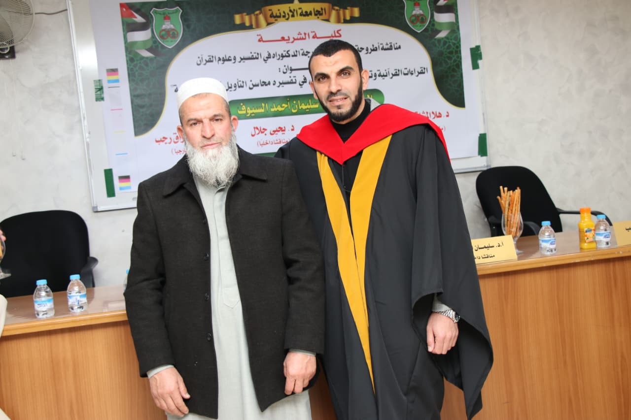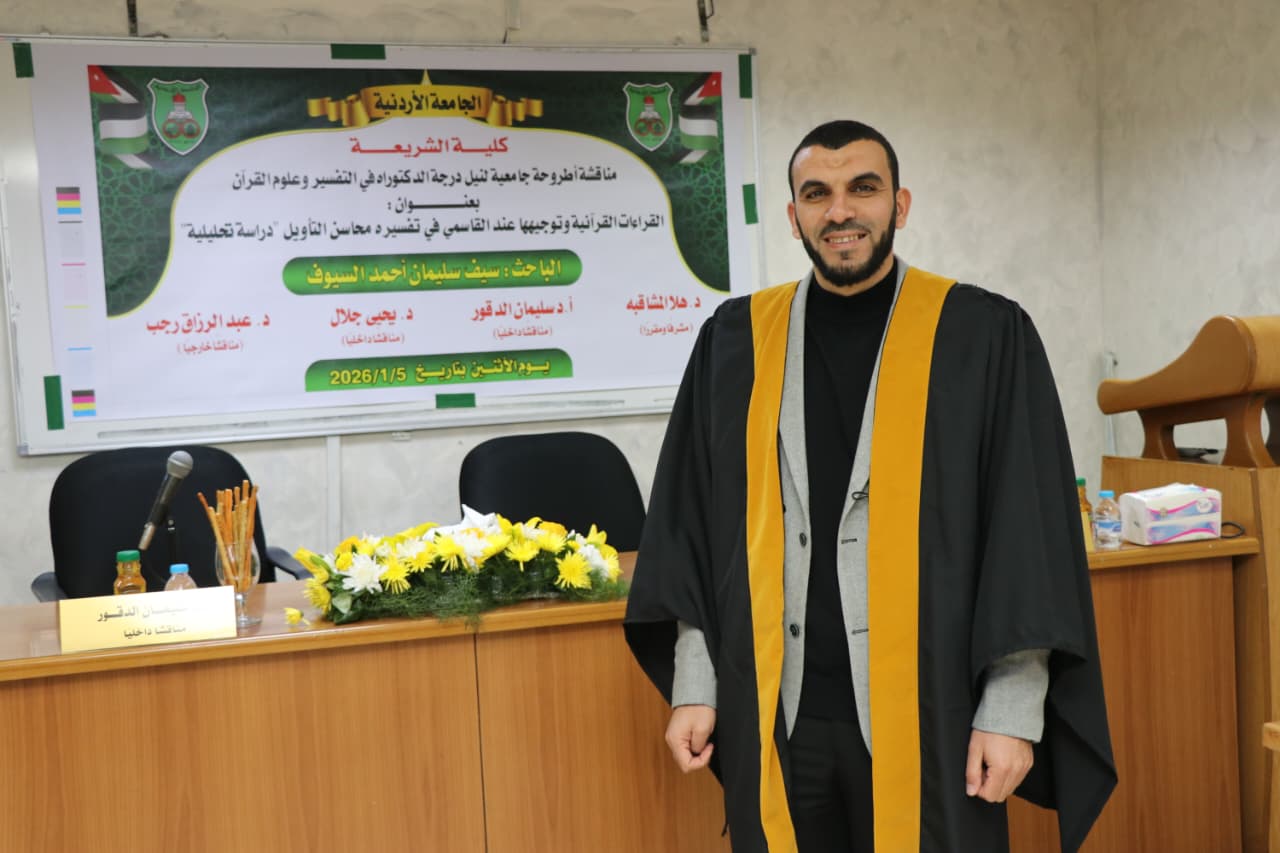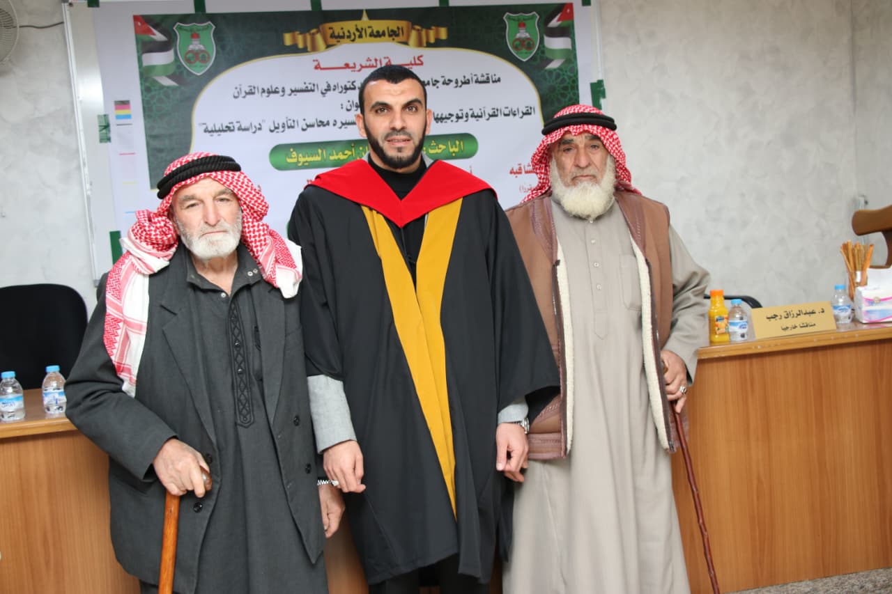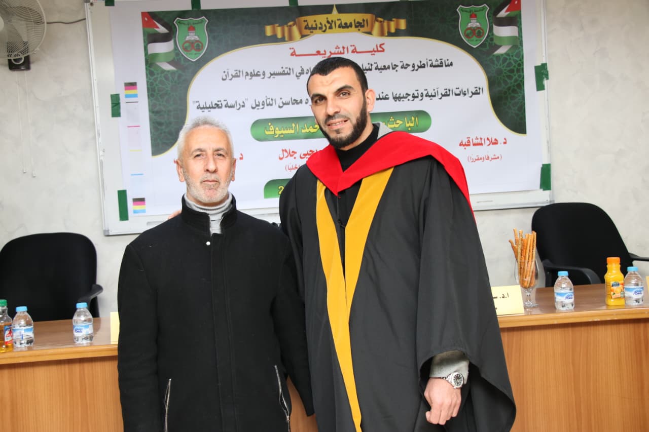 تتقدم أسرة وكالة عجلون الاخباريه بأجمل آيات التهنئه والتبريك من فضيلة الشيخ الدكتور سيف سليمان السيوف بمناسبة حصوله على شهادة الدكتوراه في الشريعة الاسلامية من الجامعة الأردنية ،، تخصص التفسير وعلوم القرآن ،، حيث جاءت الإطروحة بعنوان القراءات القرآنية وتوجيهها عند القاسمي في تفسيره محاسن التأويل.