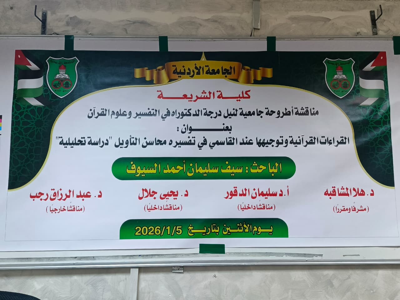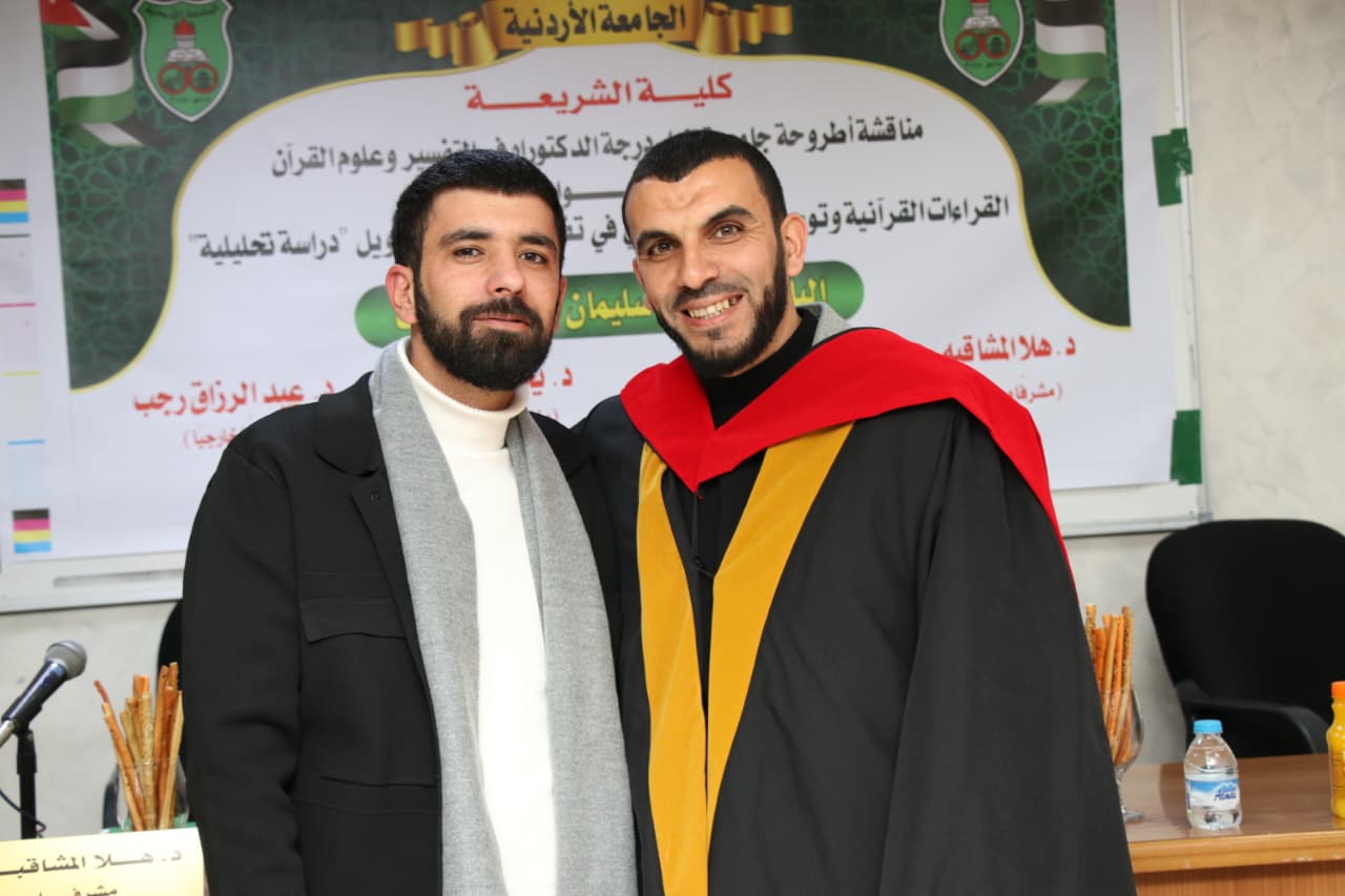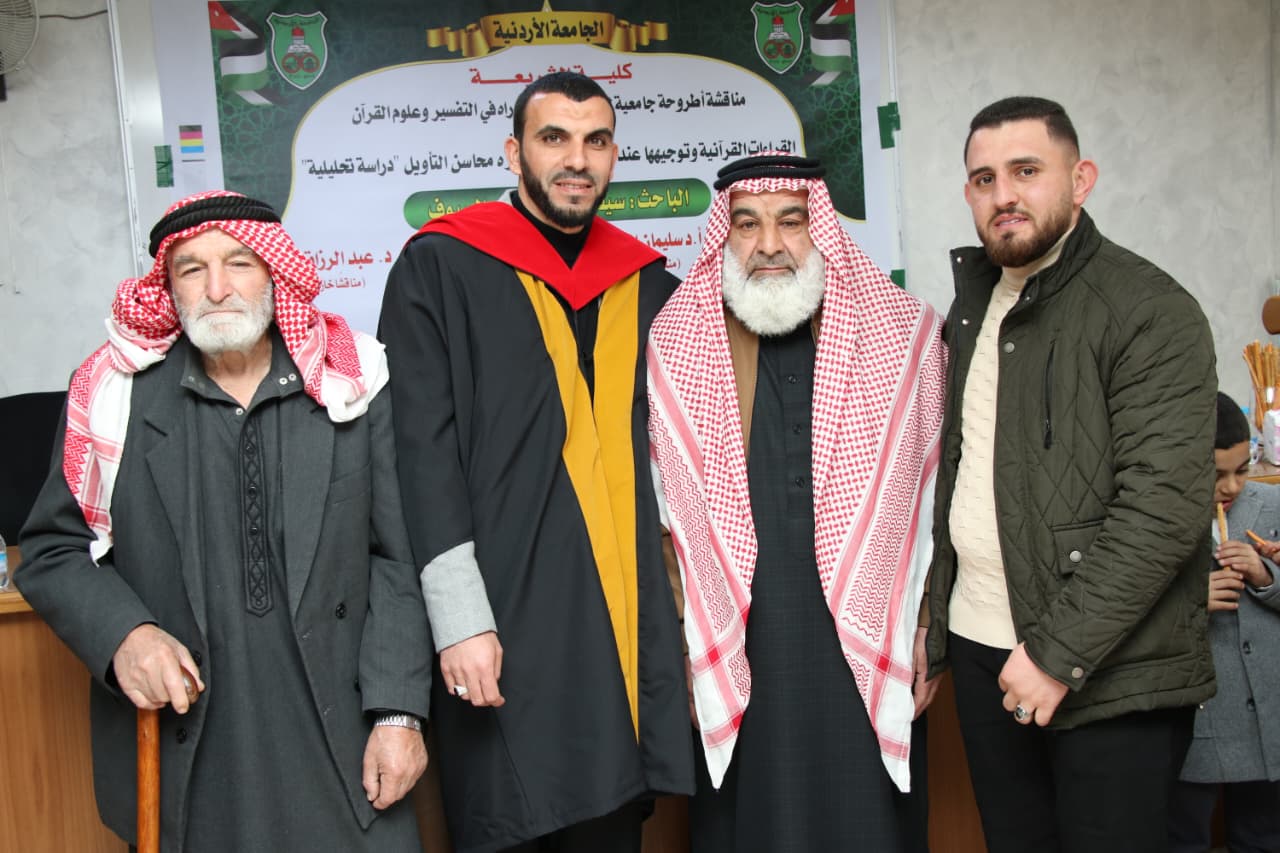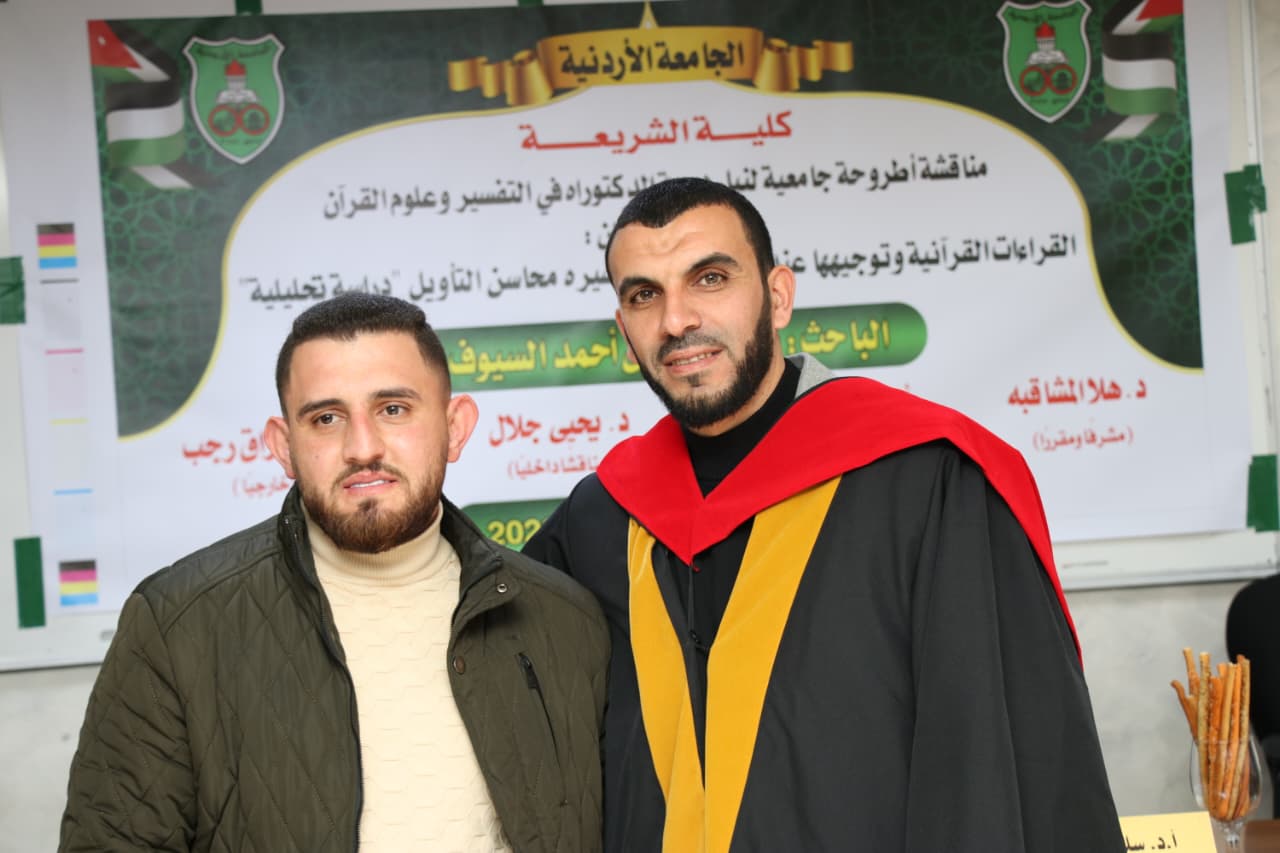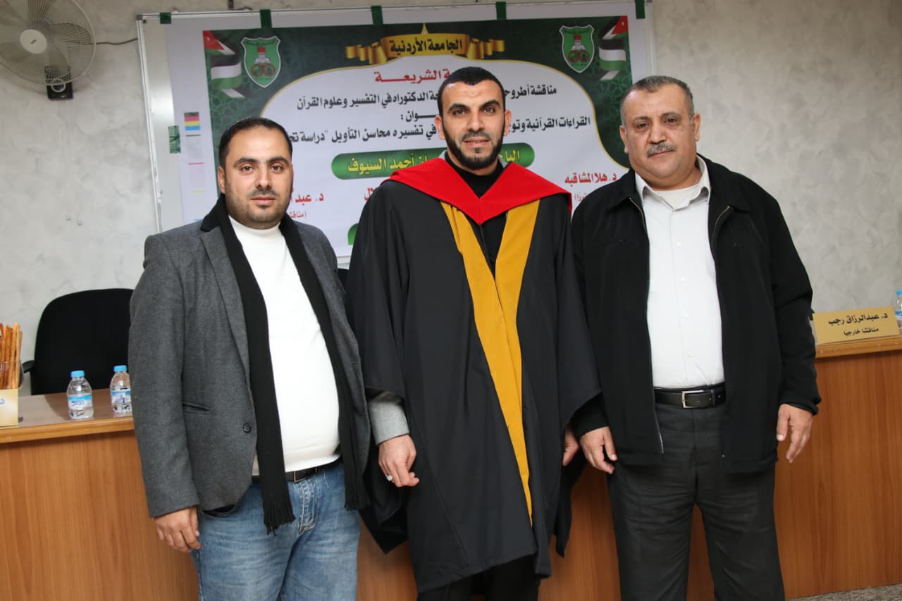 تتقدم أسرة وكالة عجلون الاخباريه بأجمل آيات التهنئه والتبريك من فضيلة الشيخ الدكتور سيف سليمان السيوف بمناسبة حصوله على شهادة الدكتوراه في الشريعة الاسلامية من الجامعة الأردنية ،، تخصص التفسير وعلوم القرآن ،، حيث جاءت الإطروحة بعنوان القراءات القرآنية وتوجيهها عند القاسمي في تفسيره محاسن التأويل.