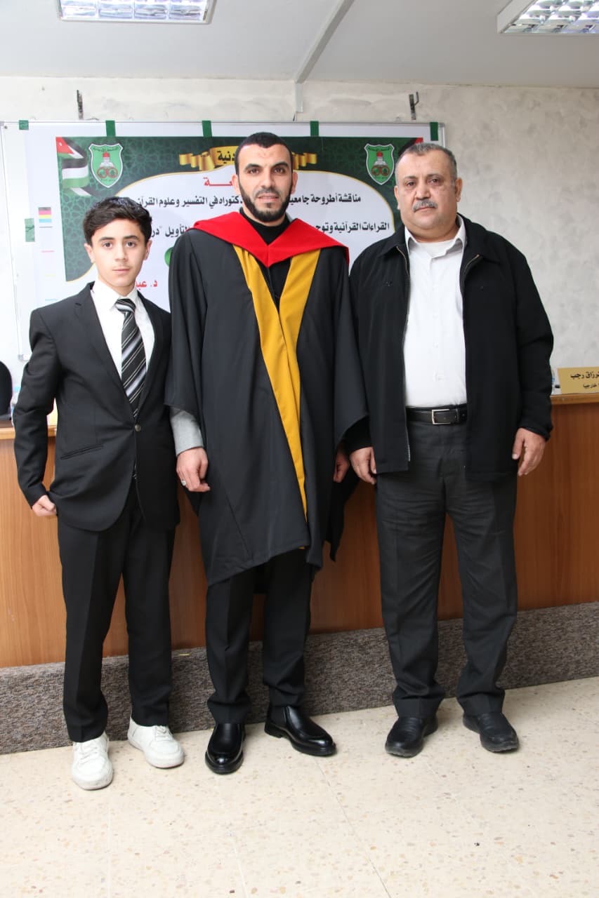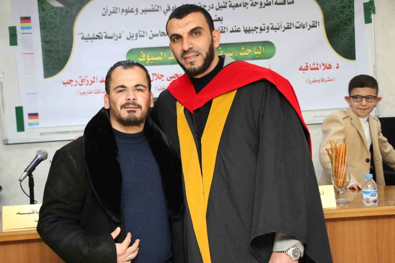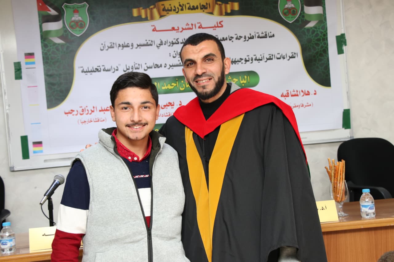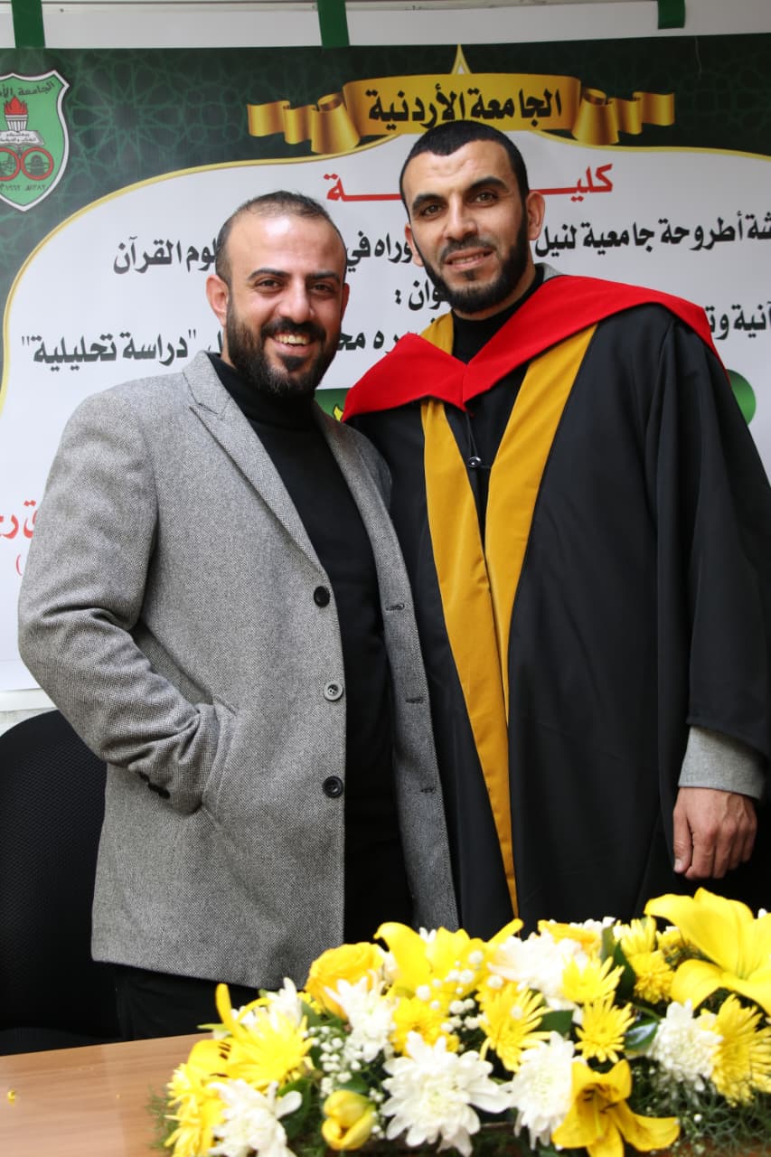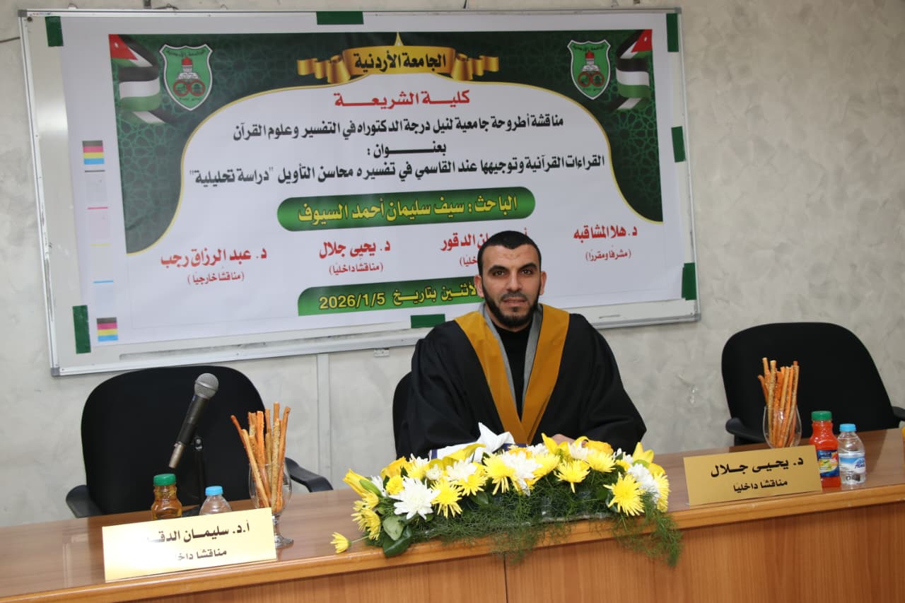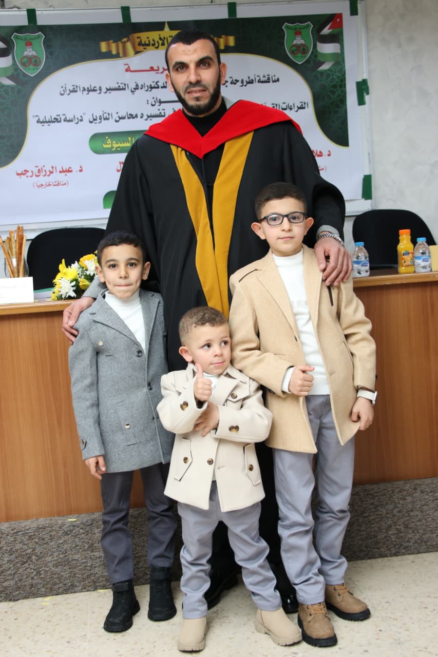 تتقدم أسرة وكالة عجلون الاخباريه بأجمل آيات التهنئه والتبريك من فضيلة الشيخ الدكتور سيف سليمان السيوف بمناسبة حصوله على شهادة الدكتوراه في الشريعة الاسلامية من الجامعة الأردنية ،، تخصص التفسير وعلوم القرآن ،، حيث جاءت الإطروحة بعنوان القراءات القرآنية وتوجيهها عند القاسمي في تفسيره محاسن التأويل.
