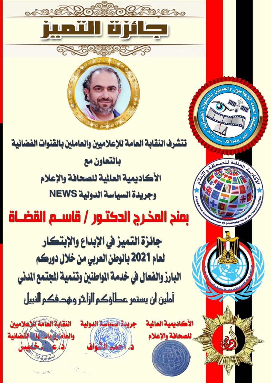تتقدم أسرة وكالة عجلون الإخبارية بخالص المباركة والتهنئة من المخرج الدكتور قاسم أحمد حسن القضاه جائزة التميز في الإبداع والإبتكار ،،، كل أمنيات التوفيق والنجاح والى الأمام دوما إن شاء الله .