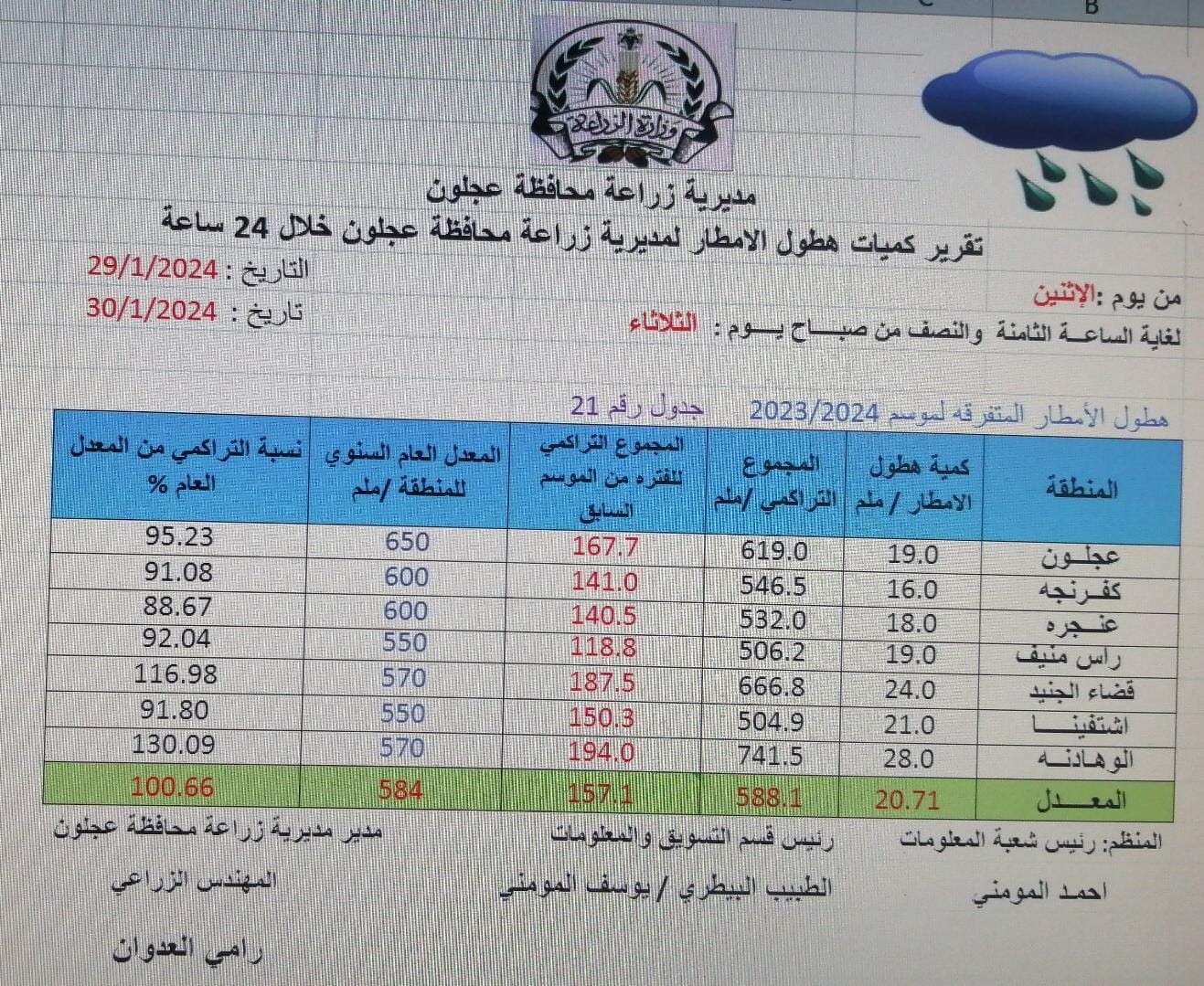 قال مدير زراعة عجلون اامهندس رامي العدوان أن محافظة عجلون تجاوزت حتى صباح اليوم الثلاثاء المعدل التراكمي السنوي لسقوط الامطار حيث بلغ معدل كمية الأمطار 588,1 ملم من المعدل السنوي الذي يقدر ب 584 ملم .