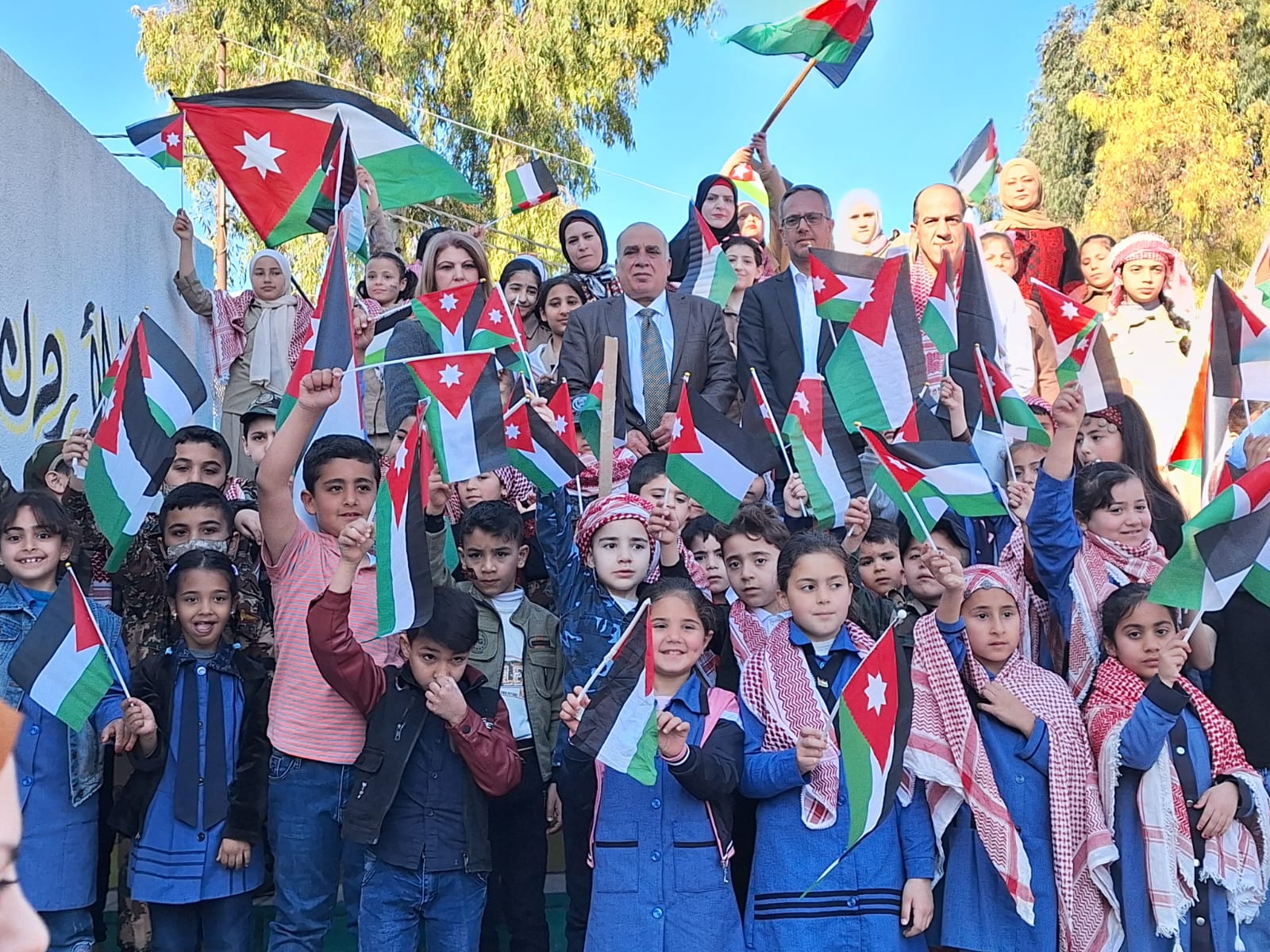 ورفع الشرع باسم الاسرة التربوية في المحافظة التهنئة لقائد الوطن بهذه المناسبة مؤكدا الولاء والانتماء للقيادة ولعرش والاسرة الهاشمية وسيبقى للعلم في قلوبنا مكانة عظيمة لا تُوازيها مكانة في وجدان وقلوب وعيون أبناء الوطن بكافة مستوياتهم ةدوفي يومه يزداد فخرنا براية العز والمجد التي تظلنا ويتعمق تصميمنا على أن تبقى دائما رمزا للتميز والتقدم مشيرا الى أن 200 مدرسة و 50 الف طالب وطالبة احتفلوا بهذه المناسبة العظيمة .