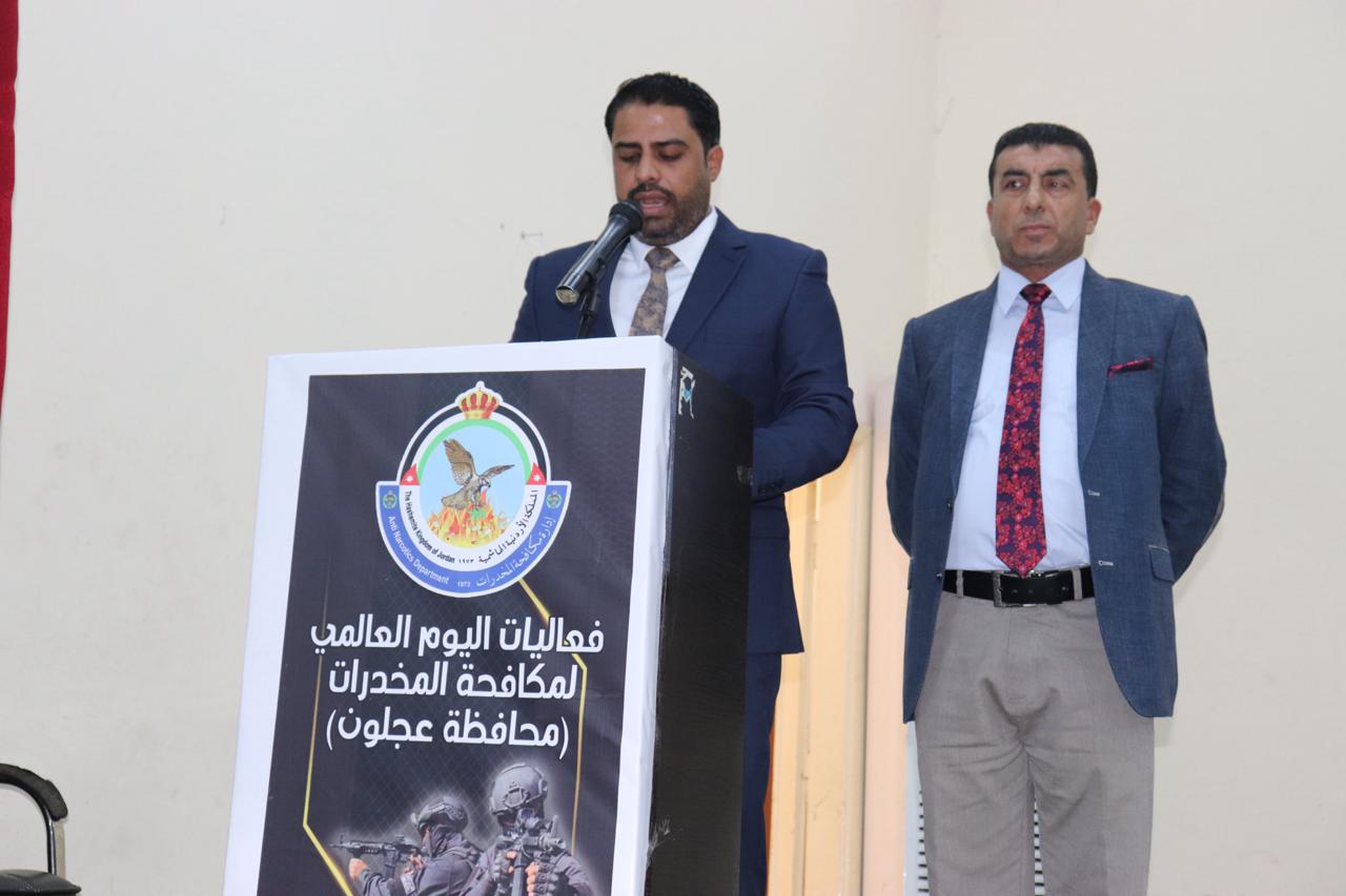 نظّمت مديرية الأمن العام، ممثلة بإدارة مكافحة المخدرات ومديرية شرطة عجلون والشرطة المجتمعية، احتفالاً باليوم العالمي لمكافحة المخدرات تحت شعار (بهمة الشباب نكافح المخدرات) تحت رعاية محافظ عجلون نايف الهدايات وبحضور قائد أمن إقليم الشمال بالإنابة العميد وصفي العزام في القاعة الهاشمية التابعة لبلدية عجلون الكبرى بحضور رؤساء الجامعات ومدراء الأجهزة الأمنية والدوائر الحكومية والخاصة وأعضاء المجالس المحلية ومعسكرات الحسين للعمل والبناء والهيئات الشبابية، ضمن جهودها المستمرة لنشر الوعي المجتمعي حول مخاطر آفة المخدرات وسبل الوقاية منها